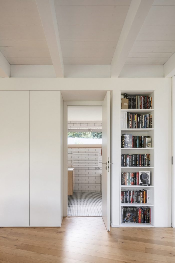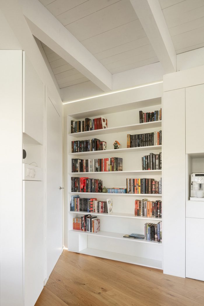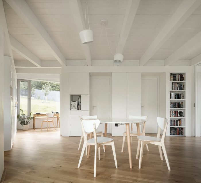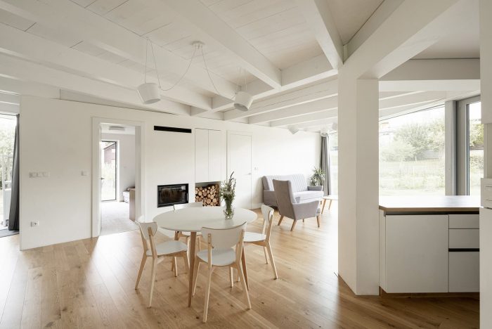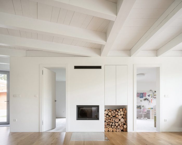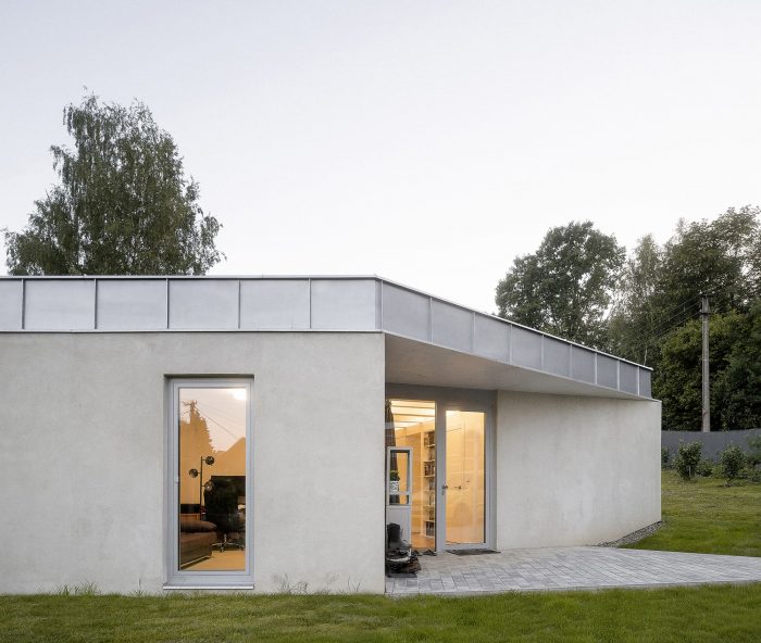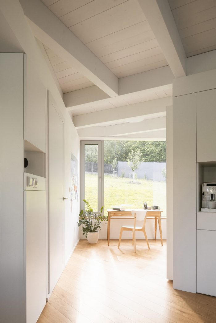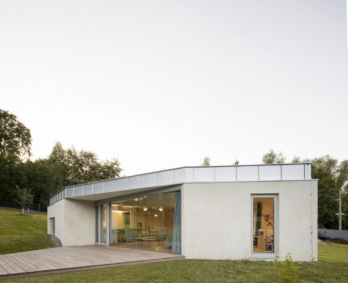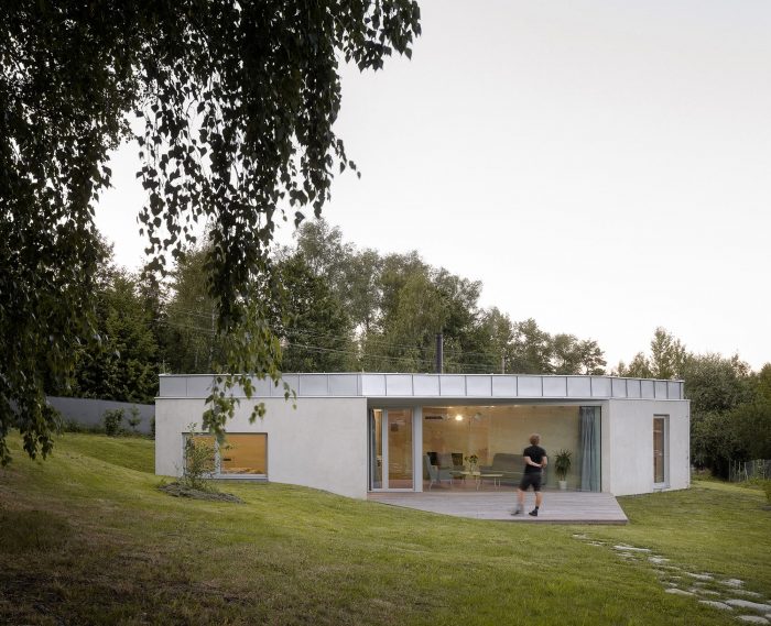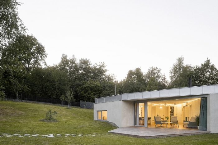 The space is connected to the garden as much as possible by large glass surfaces. Individual activities in the common area can be separated by a revolving bookcase and sliding doors. The common square can thus be flexibly changed according to the current needs of the family. One of the authors Šimon Bierhanzl says: “The house is partially embedded in the ground and its overall shape, low height, the chosen extensive green roof, and natural character are integrated into the garden, which becomes an integral part of the house and vice versa.”