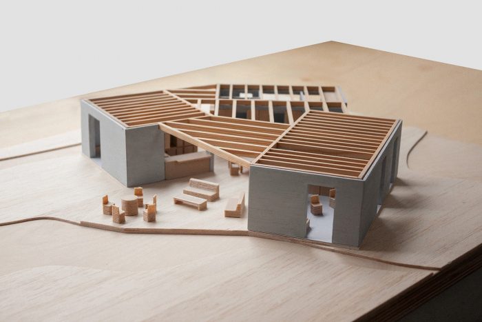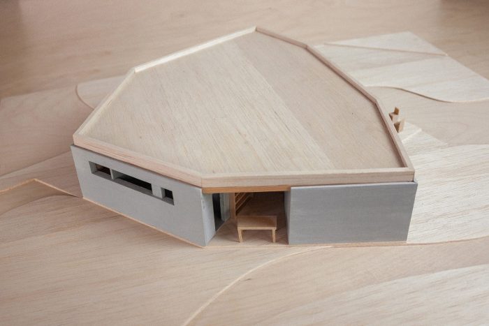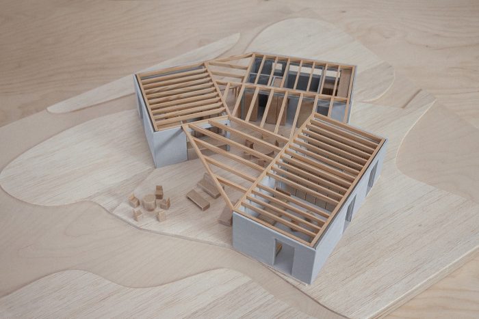 The basic blocks were designed by the architects in a simple structural and material design. They are made of standard insulated blocks on concrete foundations. The masonry is reinforced with a concrete structure and the ceiling is carried out by beams. The living room, hallway, and study area are covered by a timber ceiling creating a playful articulation based on the geometry of the basic blocks. The beams converge to a center above a concrete pillar in the kitchen. After a year of use, the house is a home, an occasional workplace for a talented writer, and maybe most importantly a bridge to the garden and the nature around.