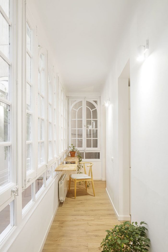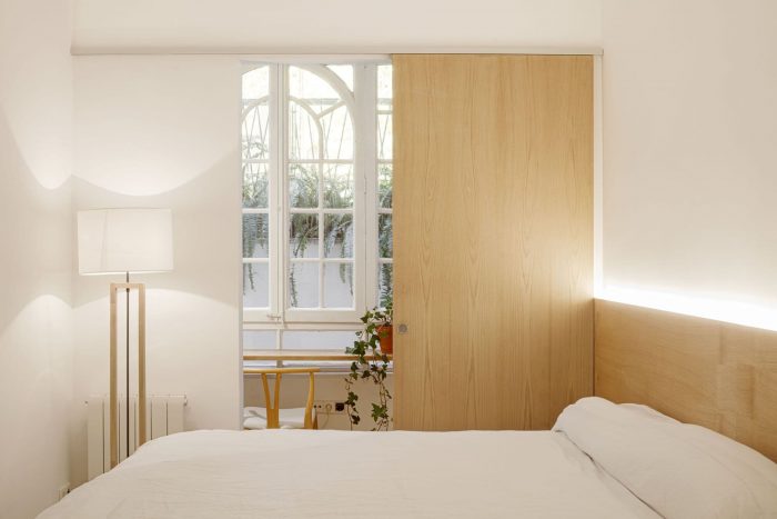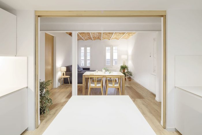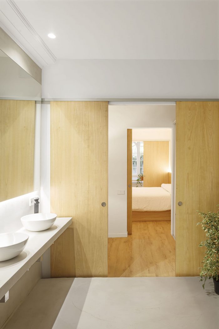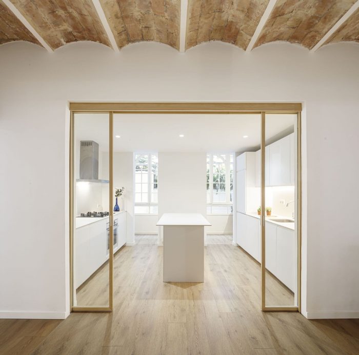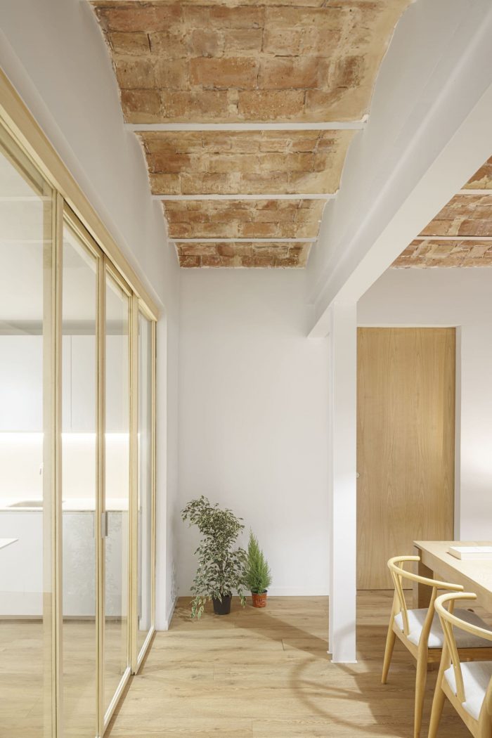 Modernism and materiality. The design highlights the original architectural heritage, recovering the identity of the modernist building elements. Existing ceramic vaults and old ceilings with moldings are restored, seeking harmony with the new project materials. The presence of white walls gives more light to the space, while the wood of the sliding doors and the flooring create a warm atmosphere.