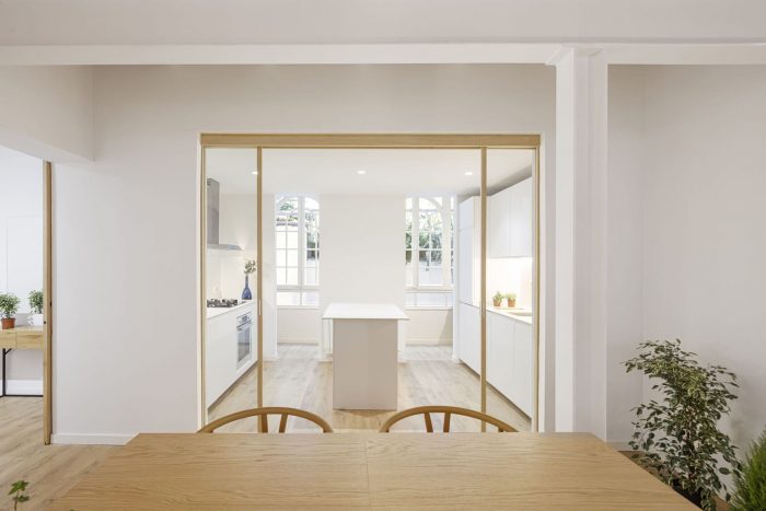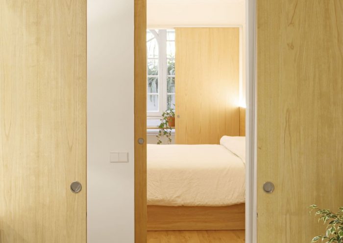 All the boundaries between the different spaces, except the entrance door, consist of sliding chestnut doors that glide in front of the white walls. This system creates flexible and diffuse boundaries that give rise to a dynamic composition where the rooms can be related, totally or partially, to each other. When the doors are closed, each room is an entity in itself, while when the doors are open, each room is part of a unit. The doors expand or contract the space while providing privacy to the users. In the kitchen, slender glass sliding doors promote the incidence of natural light from the gallery, allowing for acoustic insulation from the living-dining room area.