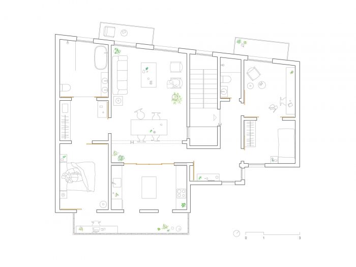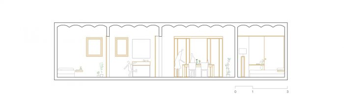 结构和方案。原来的房子是完全分割的,走廊和房间几乎不与外部相连。第一个意图是打开空间,恢复陶瓷拱顶,拆除现有的墙壁和假天花板。该设计利用了建筑的现有结构,由一连串垂直于街道的五面承重墙形成,创造了一个简单而富有诗意的语言,产生了一个灵活的程序。
