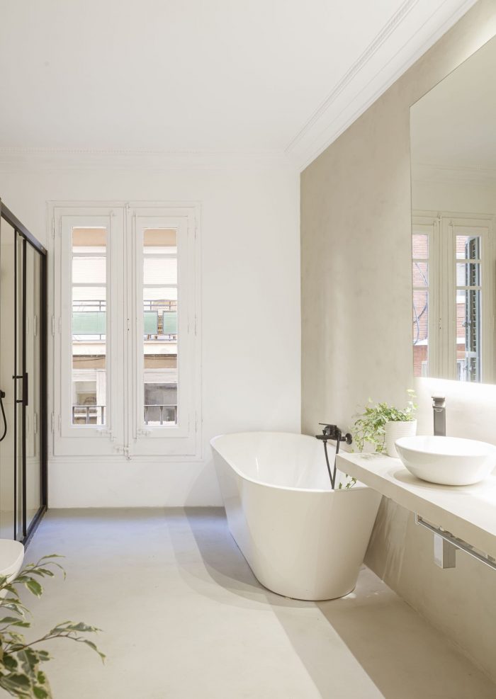 In the main bathroom, the micro cement walls and flooring create a cohesive and harmonious design with the high ceilings adorned with moldings. The freestanding bathtub stands as a sculptural ceramic element that aligns with the formal language of bath bowls. Another characteristic element of the modernist movement is the gallery formed by arched glazed wooden carpentry. These carpentries, together with the rest of the windows of the house, are restored and painted white, maintaining their singular aesthetic character and highlighting the memory of the place.