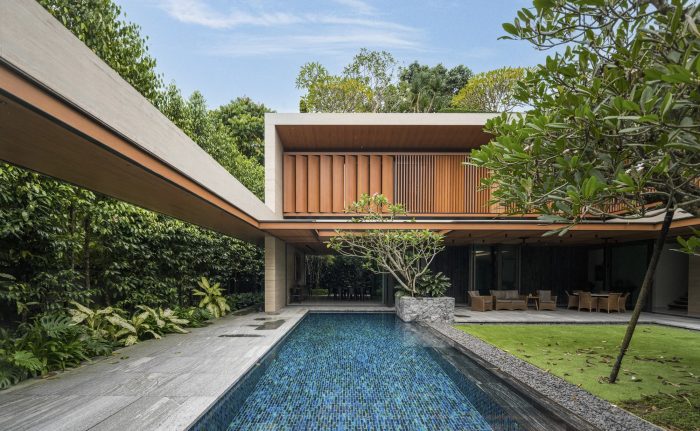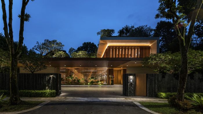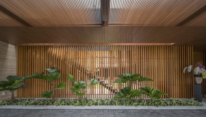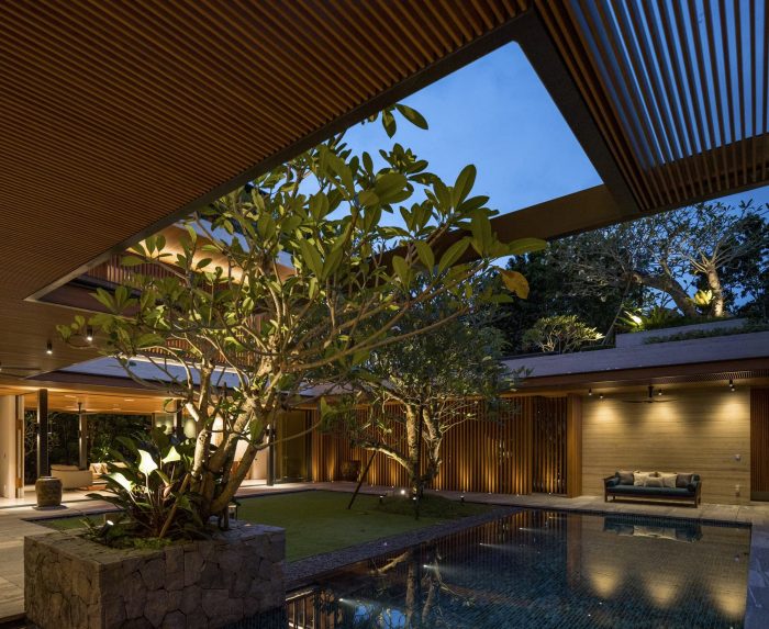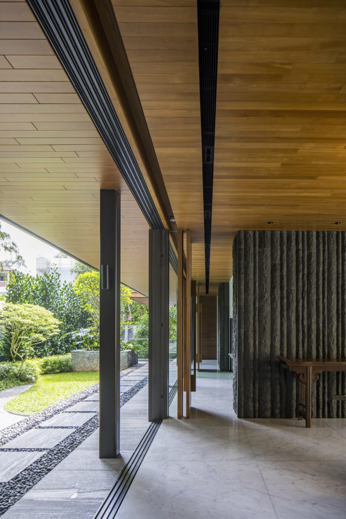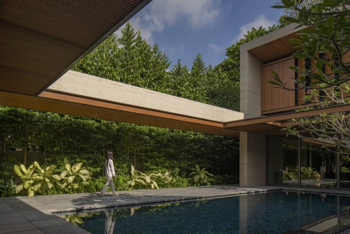 An uninterrupted and expansive porte-cochère at the entrance offers glimpses into the flora and fauna a bliss within. The home centers itself around a biophilic courtyard, with a fine collection of Frangipani trees elegantly orchestrated across each floor. The architectural timber sunscreens and travertine stone seek to complement this green composition.