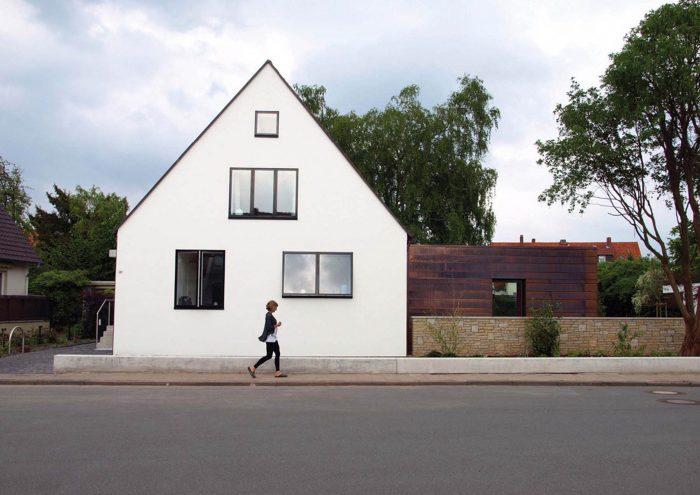 After the renovation the old “Siedlungshaus” is barely recognizable but still it remains an integrative part of the surrounding neighbourhood. Reduced to its fine proportions and its simple volume it now shines in clear white and refreshingly stands out in order to coexist next to its modern addition. Without its former roof overhang the plain volume of the existing house steps into the foreground. The roof edge is shaped by a folded copper strip, which is flush-mounted with the white plastered walls. This clarity is further emphasized by flush-mounted windows with slim black wood-aluminium frames.