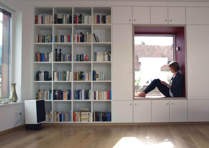 The living room in the new part of the house features a cabinet wall that offers storage space, while a linoleum-lined niche serves as a window seat. On the opposite site a large sliding door connects the living room to the inner courtyard.
