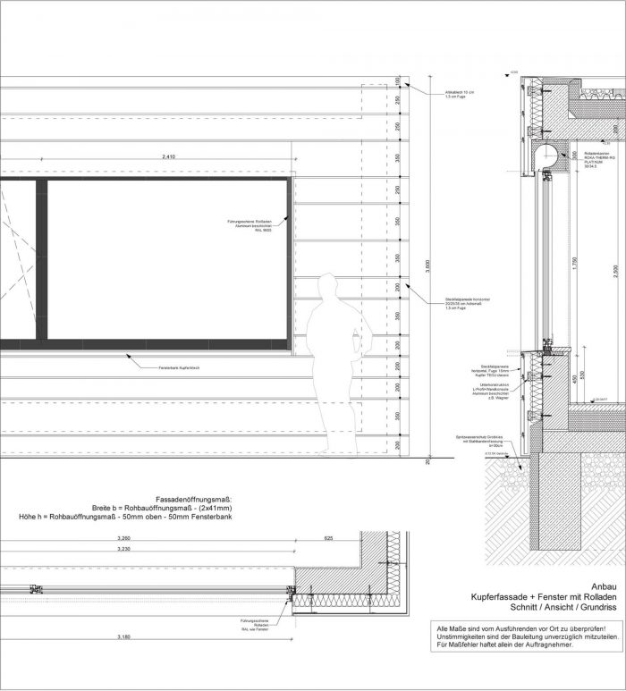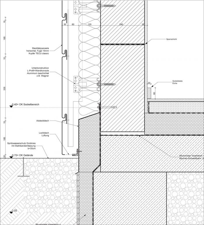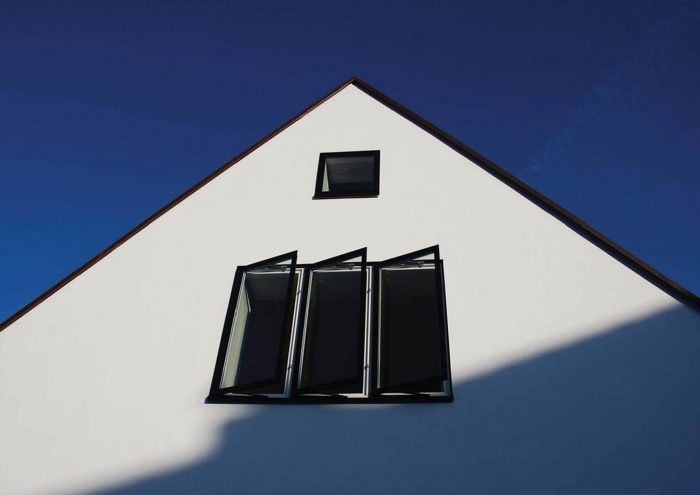 The exterior walls were covered in a composite heat insulation system out of mineral fibreboards, and all openings were fitted with new high-standard wood-aluminium windows. The old roof structure was saved but the rafters were doubled-up in order to gain more space for a thick insulation layer. The old dormer was replaced by a new one; insulated and clad in copper. The ceiling of the cellar was subsequently outfitted with insulating boards. The extension has a back-ventilated facade with 14cm of mineral wool insulation and highly-insulating aluminium windows.