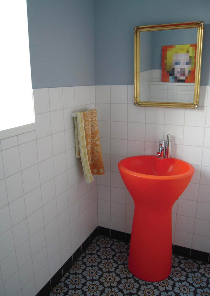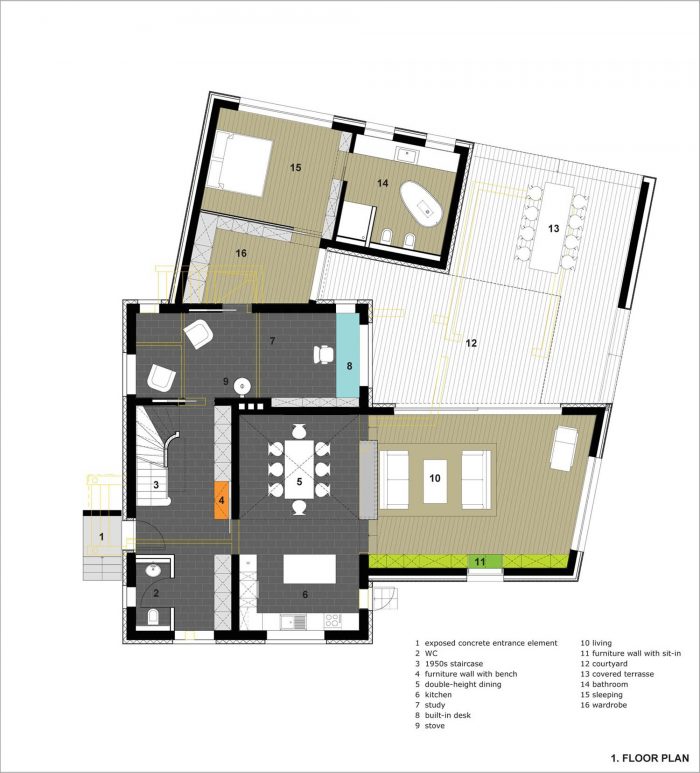 The floors are covered with large-format black tiles, all walls are white. The old staircase remains and was enriched by a curved built-up railing. All windows have hidden frames and deep sills. A bright yellow sliding door, red linoleum, as well as the guest toilet with its orange epoxy basin and antique stone ware tiles are colour spots, that form a fresh contrast to the simple white built-in furniture. Unlike the old house the new addition is made up out of warm natural colours; the oiled oak parquet connects the interior spaces to the courtyard and the garden.