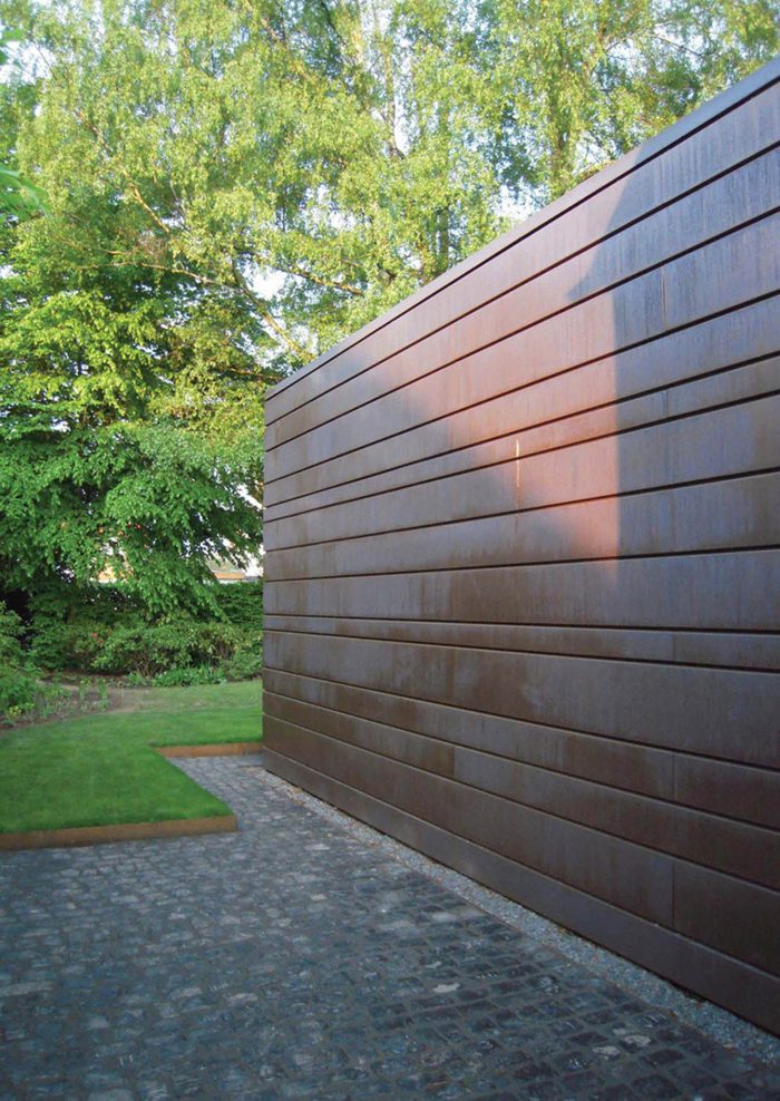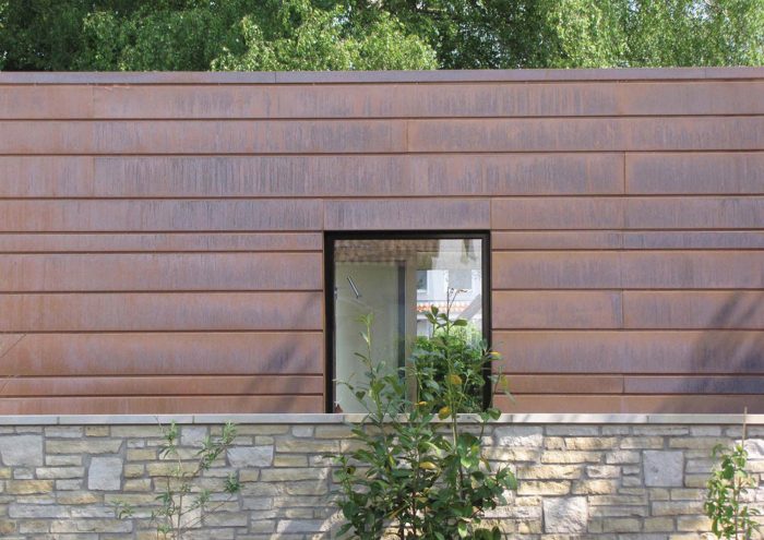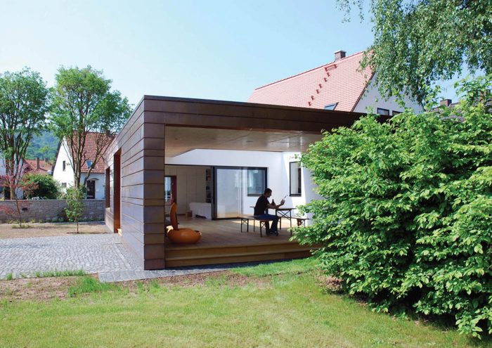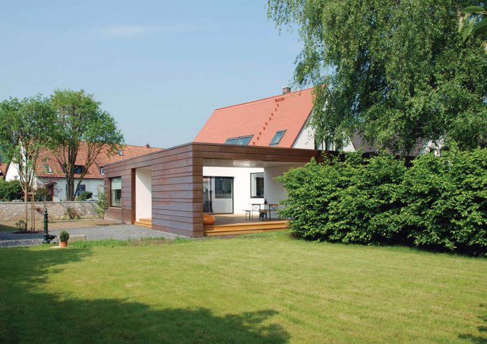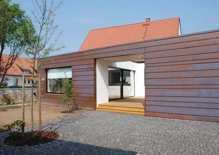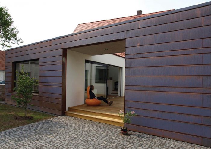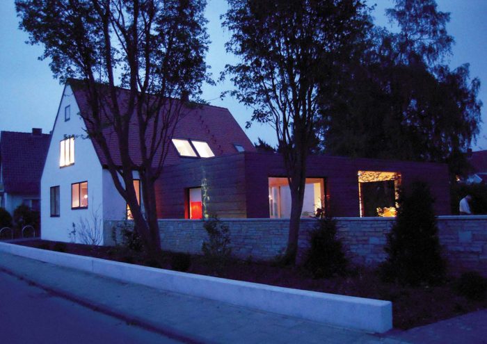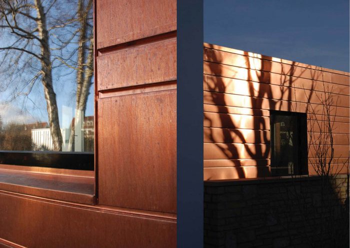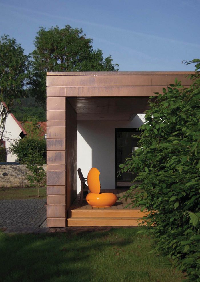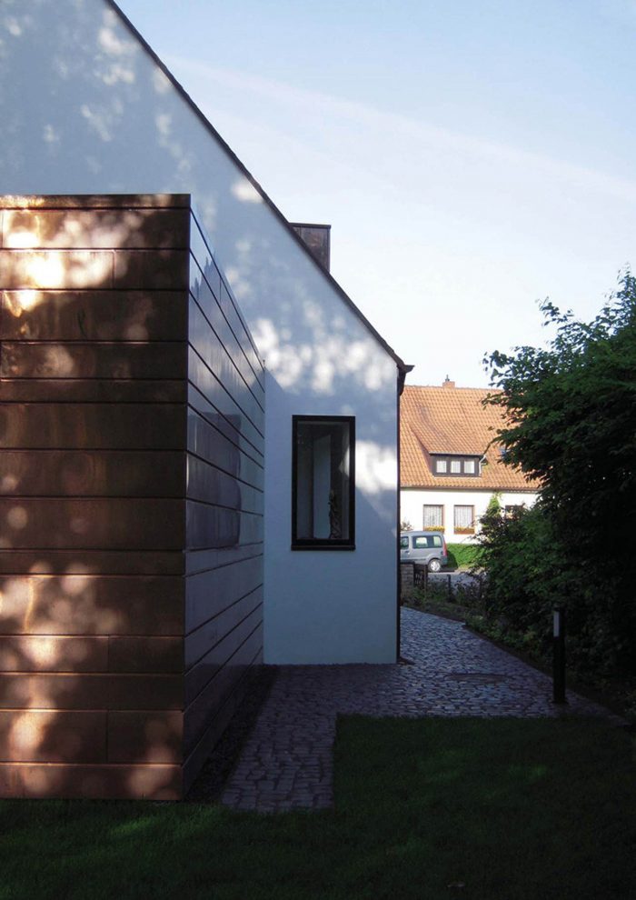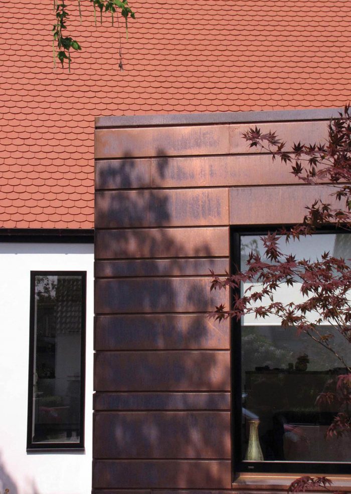 The white simple look of the existing house forms a strong contrast to the striking copper cladding of the extension. Horizontal panels in several different widths enclose the new addition with its white plastered courtyard like a protective coil. The copper glows in warm lively colours, which change continuously with the weather and the years.
