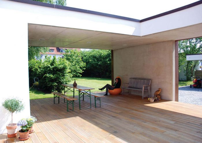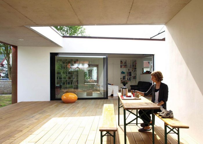 The courtyard is the biggest “room” of the whole house. Its layout allows for direct sunlight as well as shade at any time of the day. Part of the terrace is covered; two large openings frame the views into the garden, while a neatly positioned exposed concrete wall offers protection against too much transparency.