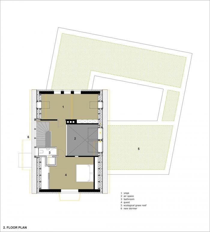 老房子后面的三个小房间被合并,成为新的书房。从这里你可以到达扩建部分的私人空间,这些空间隐藏在现有房屋的后面。卧室里的一个大窗户通向秘密花园,而更衣室则连接到内院。老房子的上层被完全翻新,现在包含一个带小浴室的客房,以及一个可以通往阁楼的瑜伽室。