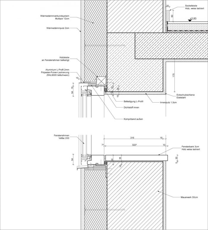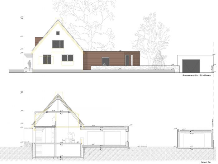 外墙用矿物纤维板制成的复合隔热系统覆盖,所有的开口都安装了新的高标准的木铝窗。旧的屋顶结构被保留下来,但椽子被加倍,以便为厚厚的隔热层获得更多空间。旧的雨棚被一个新的雨棚所取代,它是绝缘的,并且用铜包覆。地窖的天花板随后被装上了绝缘板。扩建部分有一个背风的外墙,有14厘米的矿棉隔热层和高度隔热的铝窗。