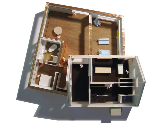 Three small rooms in the back of the old house were combined and became the new study. From here you can reach the private spaces of the extension, which are hidden behind the existing house. A large window in the bedroom opens up to the Secret Garden, while the dressing room connects to the inner courtyard. The upper floor of the old house was completely refurbished and now contains a guestroom with small bath as well as a yoga room with access to the attic.