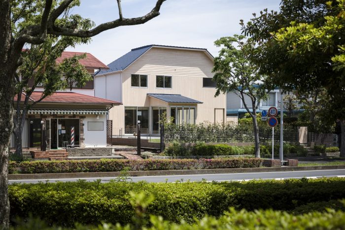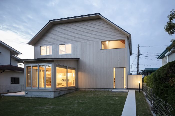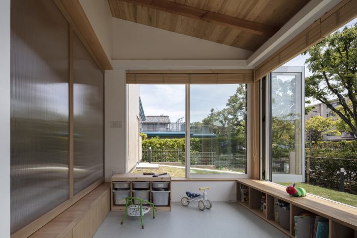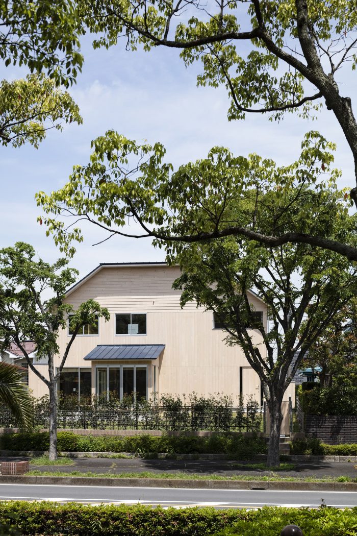 It is a space that can sometimes be used as a gazebo for playing in the garden or as a small room for entertaining guests. The floor plan resulted in a house where different spaces interact with each other, with the boundaries gradually shifting and dividing according to the subtle sense of the scale of 4.5 tatami mats, which is compact for building storage, a little wide for one person to spend time alone, and narrow for a large group. The plan was based on the idea that a system in which anyone can easily combine and discover how to use the spaces becomes an architecture that continues to be created even after it leaves the designer's hands. In other words, to make it function as a permanent system, we took the sense of scale and versatility of the traditional four-and-a-half-mat room and planned it in a simple compositional way that was once used in Japanese minka houses. The exterior of the main building, which has a hipped roof that appears to be cut off vertically in the middle, shows the potential for expansion of the building, and the addition of a lean-to roof gives the house a unique character. The walls are made of elegant, lightly textured cypress, whose appearance changes with age, creating a landscape that blends in with the lush greenery of the townscape.