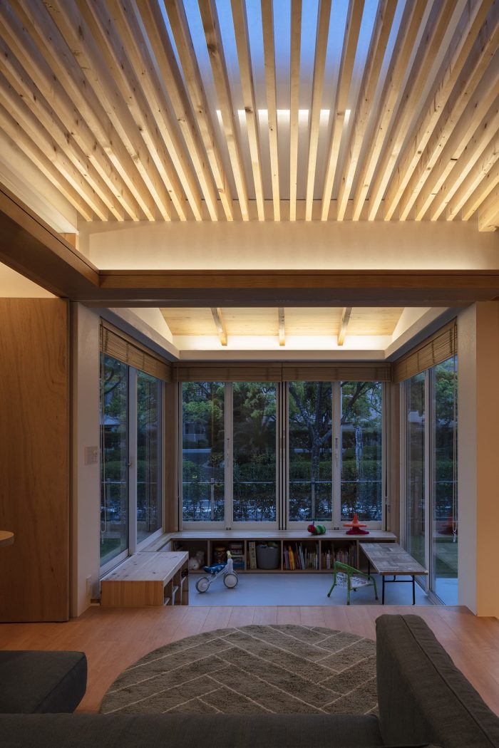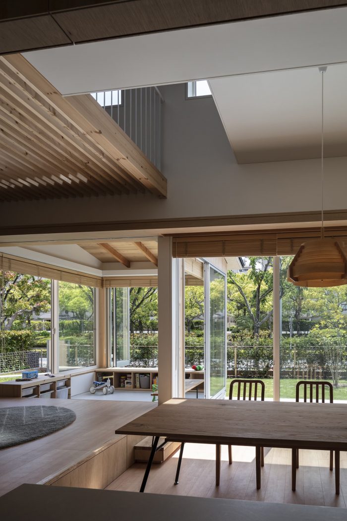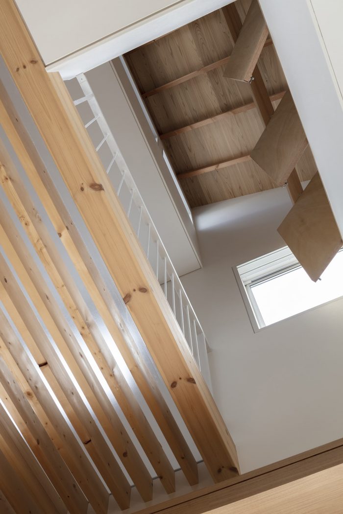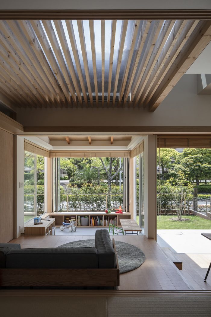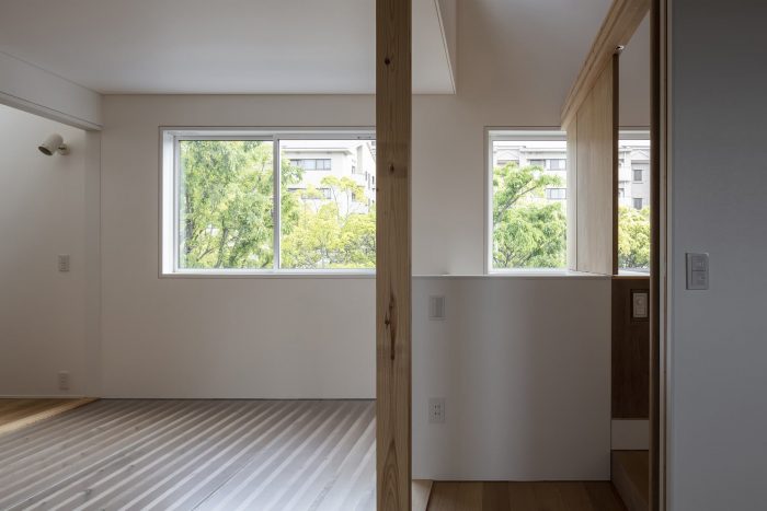 First, the ground on the north side was raised and the maximum garden was secured on the south side to secure the parking height and to achieve both privacy and openness in the living space. The ground of the garden was gently sloped, and the interior was lined with tiered floors of 4.5 tatami mats space, which were connected to the rooftop, creating a small hill-like area. To create an open and relaxing space, a variety of ceilings were planned beyond the large openings to the garden, with blindfold plantings and borrowed scenery from street trees. Each ceiling has different spatial characteristics, including a light ceiling that abstracts the sky, surrounding greenery, and human presence; an atrium that connects to the roof; a sloped ceiling that reveals the expression of rough cedar trees; and a low, white ceiling that dully reflects light. The bathroom and master bedroom, the core of the house, is in the innermost space, and the rest of the house is a collection of rooms that can be used flexibly.