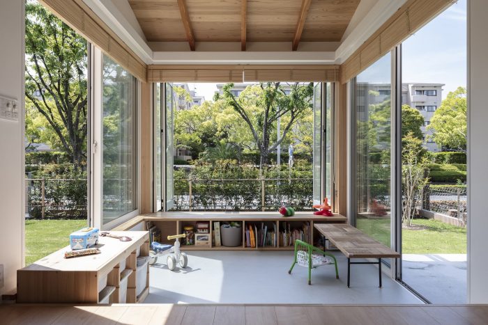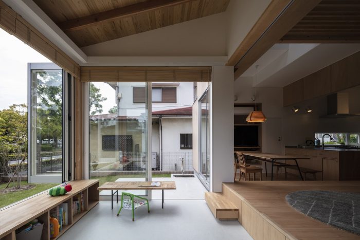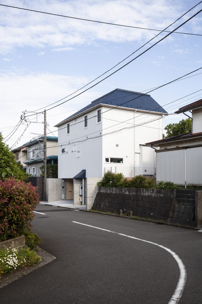 The site is part of a tiered land development project for residential lots that began in the 1980s and is located in a suburban residential area with street trees and gardens lining the south side of the site, and a covenant that systematically creates a green and favorable living environment. The owners are a young couple, their children, dogs, and a cat. The client requested a large garden to play in, an open LDK, a floor plan that would allow for easy communication and privacy as the children grow, a Japanese-style room, a rooftop, and a parking space.