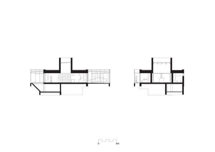 房子本身被分为两个同心的部分--内部和外部。内部部分由基本的住宅部件组成,并在帕拉第奥式的3x3网格上布局,其中心是一个垂直点缀的餐厅。外部部分由附加项目组成--不同大小和比例的天井、车库、游泳池和储藏室。它形成了一个介于两者之间的空间,既不是一个房子,也不是一个花园。它充当了两者之间的调解人。