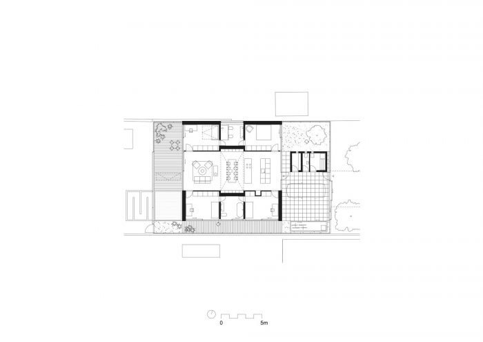房子的中心位置将地块分割成前花园和后花园。前花园被设想为郁郁葱葱的非正式植被,而隐藏在房子后面的后花园则具有更多的功能特征。