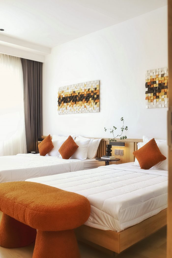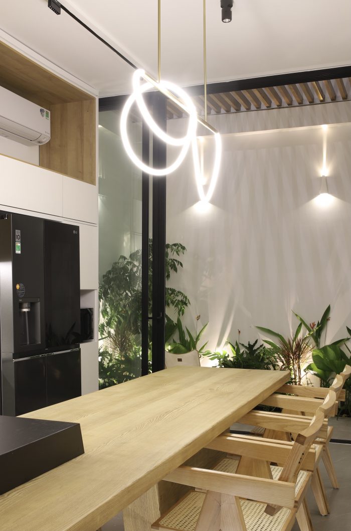 The house is located in the west, and with the typical hot and sunny climate in Phan Rang, we have used 5 layers of green trees in the facade, an iron lattice system, glass door frames, and 2 layers of curtains. This component stretches from the 2nd floor to the roof top of the house, creating a green cover while still ensuring the aesthetics of the building.