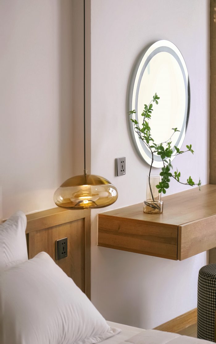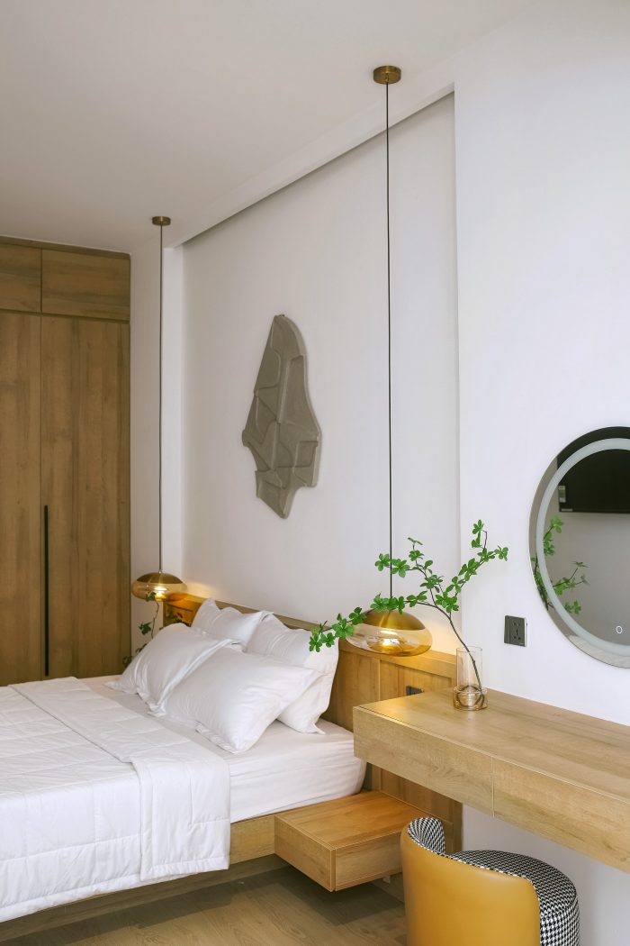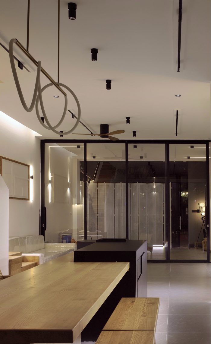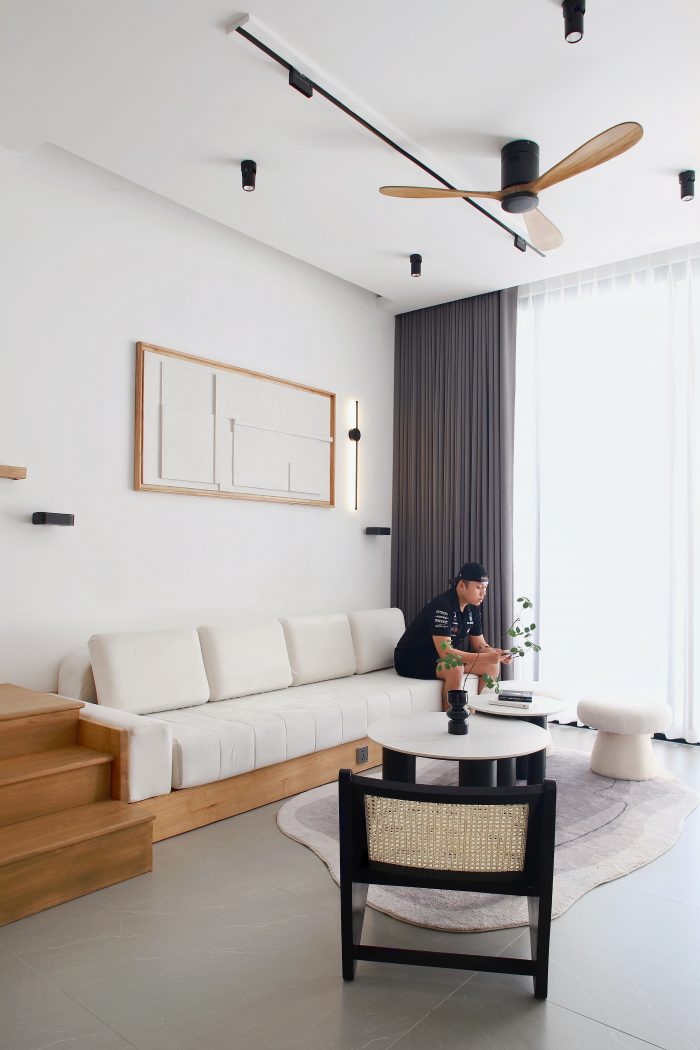 Bread House is a 4-story townhouse with a common living area connected to a small backyard and a garage on the ground floor. There are four master bedrooms on the 2nd and 3rd floors. The 4th floor consists of 2 terraces front and back, a bedroom, a mini kitchen area, and a laundry room. Particul arly for the grandparents' bedroom, the architect took advantage of the space behind to create a relaxing space with a wooden deck while still ensuring air circulation. We made use of every square metre to fulfil all the requirements, and the lighting is well-cared for, with many different types of lighting depending on the specific intended use. The project is also a flexible combination of living space and relaxation space because the architect has made the most of the natural light brought into each room to minimize the feeling of stuffiness and crampedness in the townhouse.