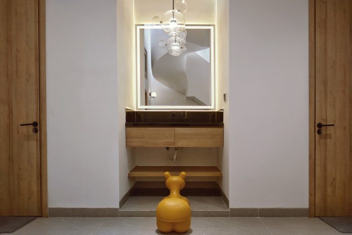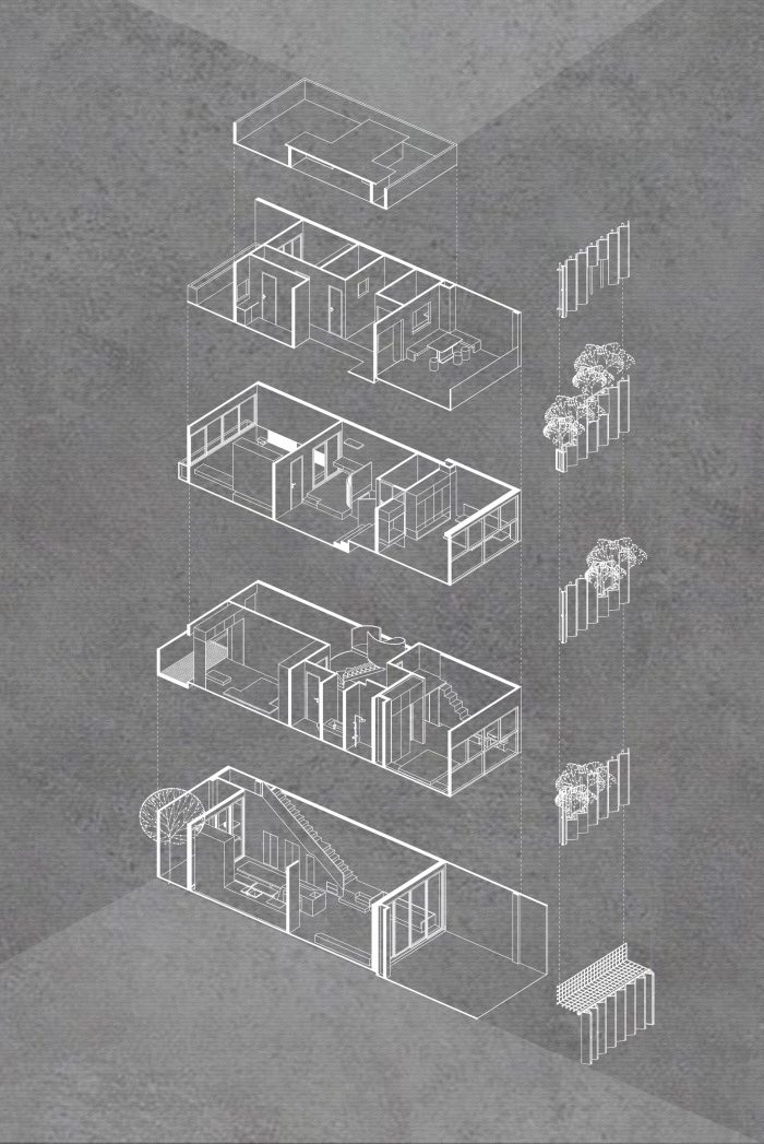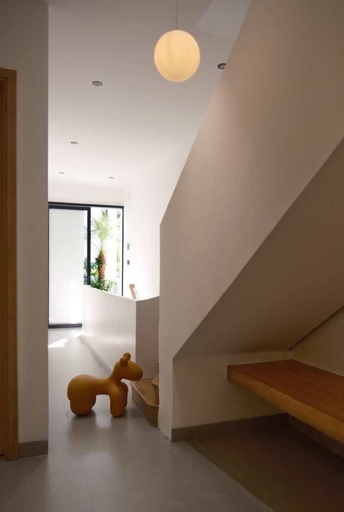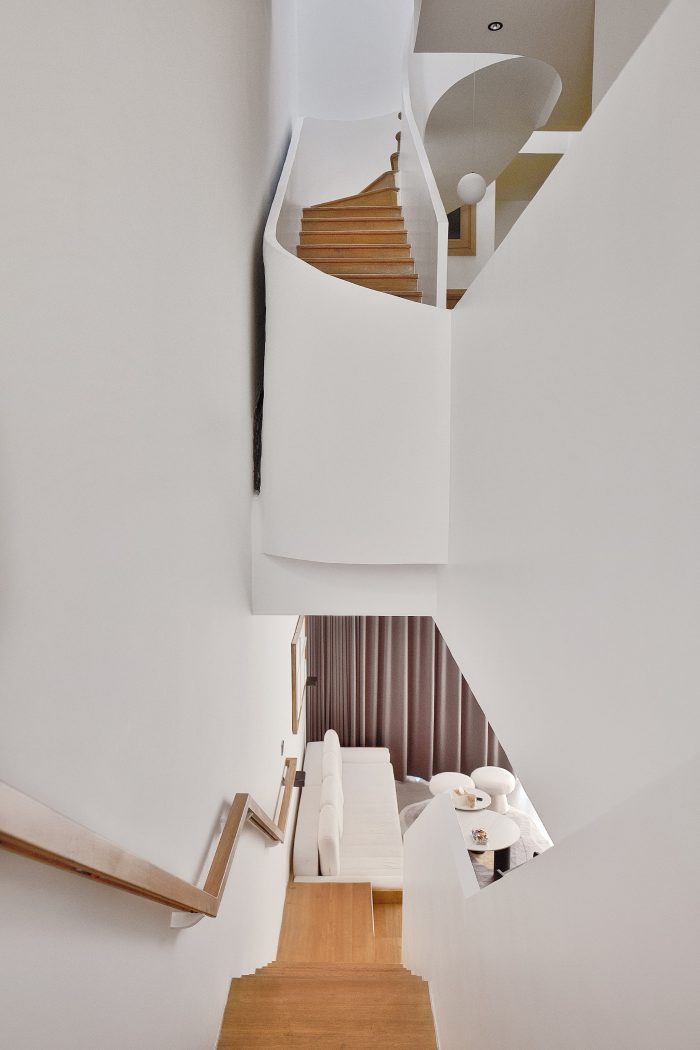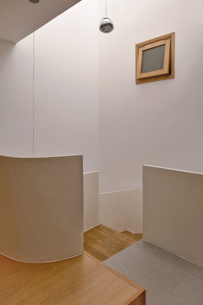 面包屋是一栋四层联排别墅,底层是一个与小后院和车库相连的公共起居区。二楼和三楼有四间主卧室。四楼有前后两个露台、一间卧室、一个小型厨房和一个洗衣房。特别是祖父母的卧室,建筑师利用后面的空间,在保证空气流通的前提下,建造了一个带有木质露台的休闲空间。我们充分利用每一平方米的空间来满足所有要求,照明方面也做了精心安排,根据具体用途的不同,采用了多种不同类型的照明。该项目还将生活空间和休闲空间灵活地结合在一起,因为建筑师充分利用了每个房间的自然采光,最大限度地减少了联排别墅的闷热和拥挤感。