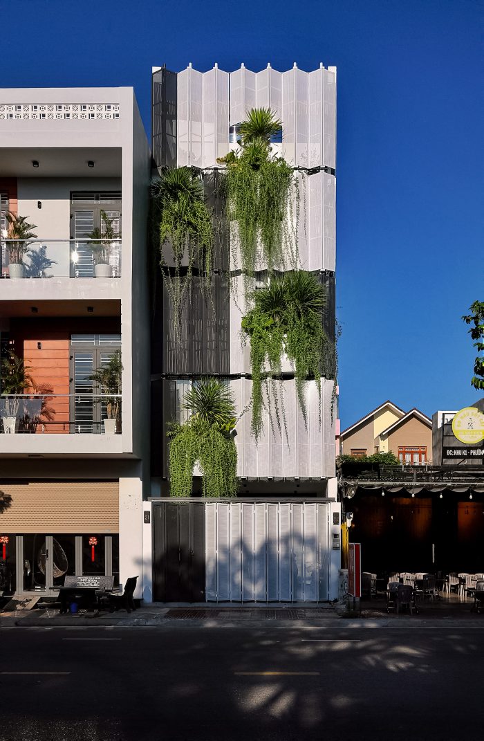 这栋面积不大(5x18 米)的房子是四个家庭三代人的生活空间,坐落在攀牙市繁华的市中心。要在老式联排别墅中认出面包屋的杰出建筑并不难,因为它的外墙是金属板和绿树鲜花交织而成的独特外墙。