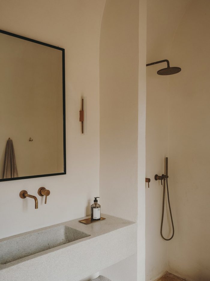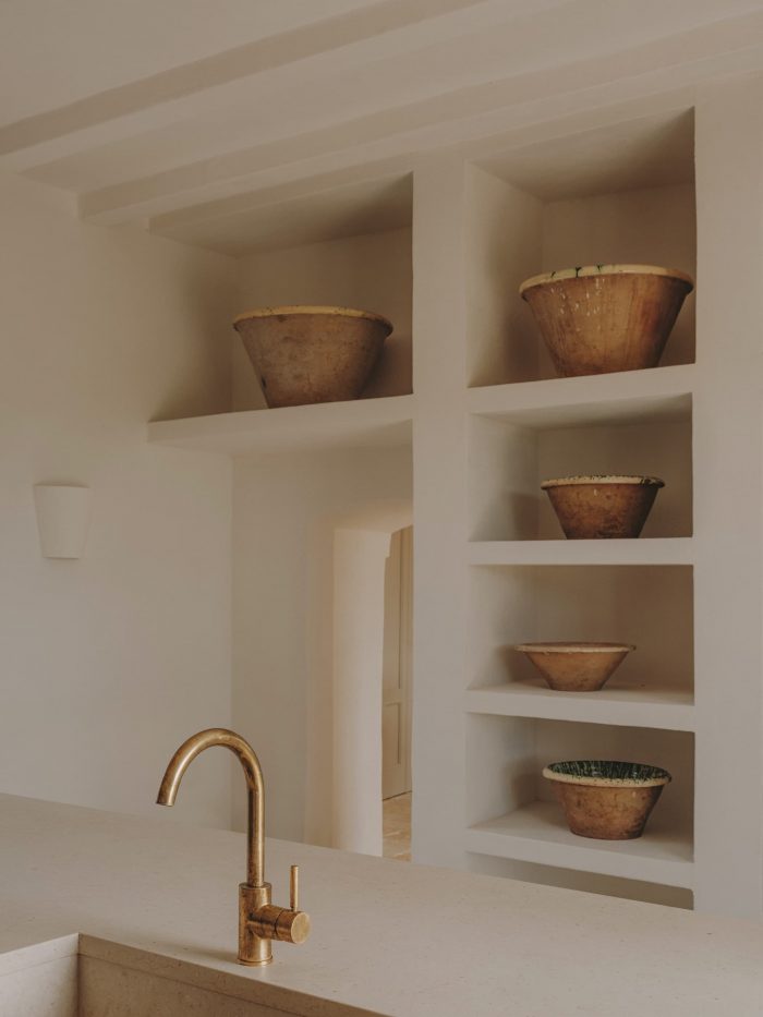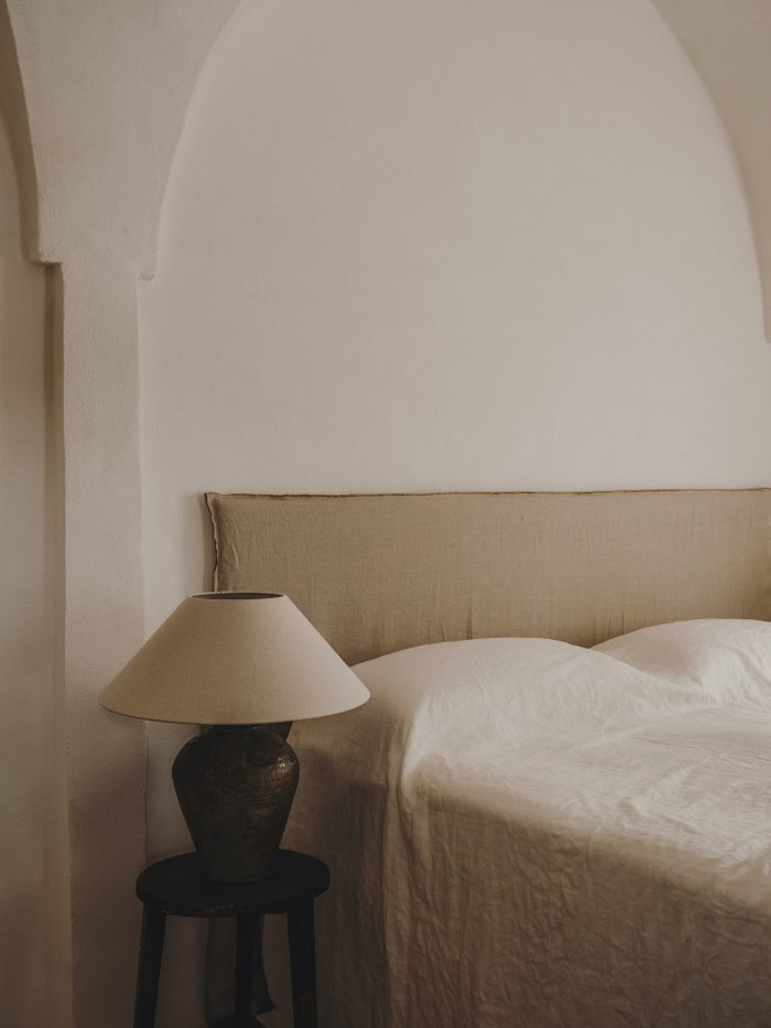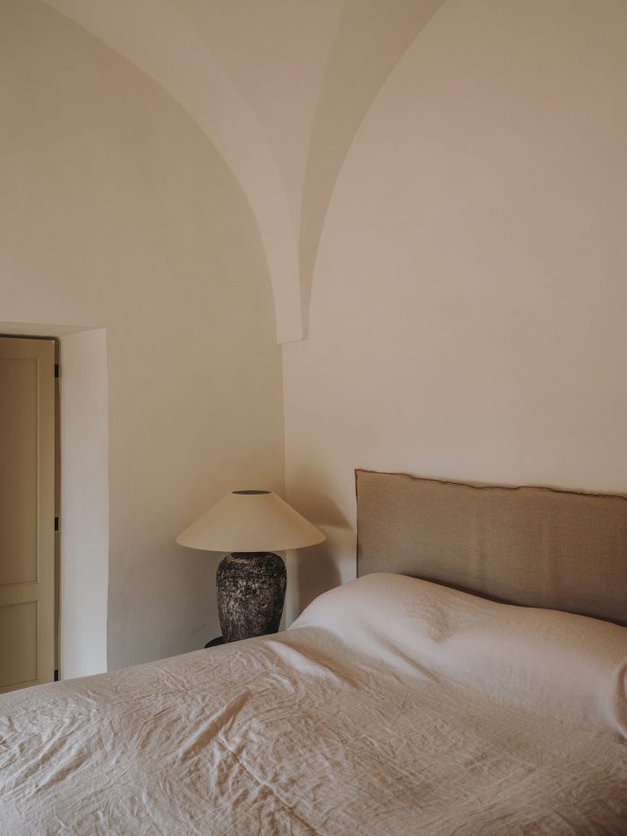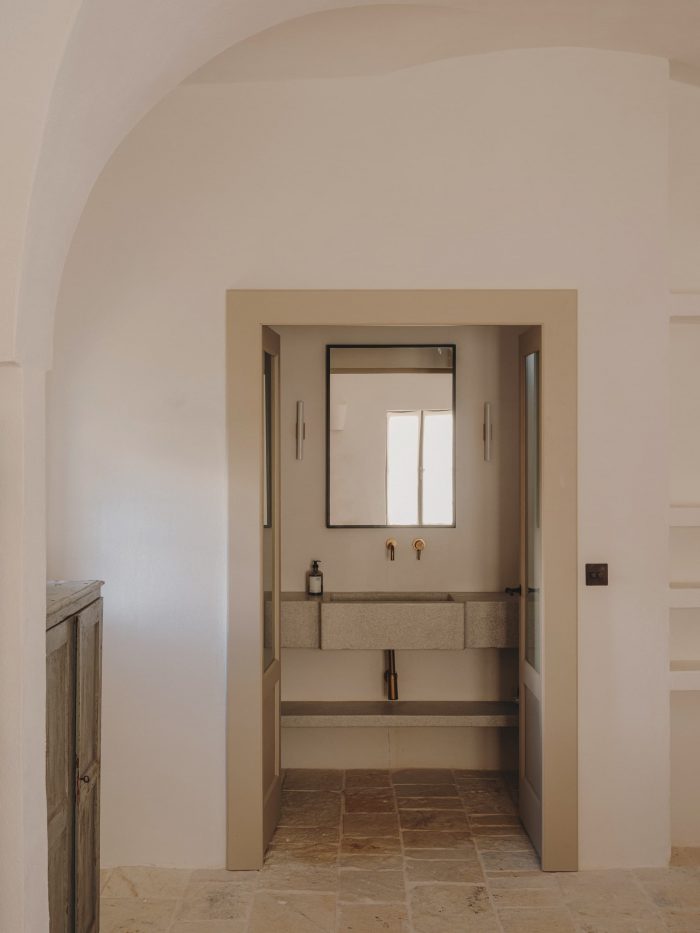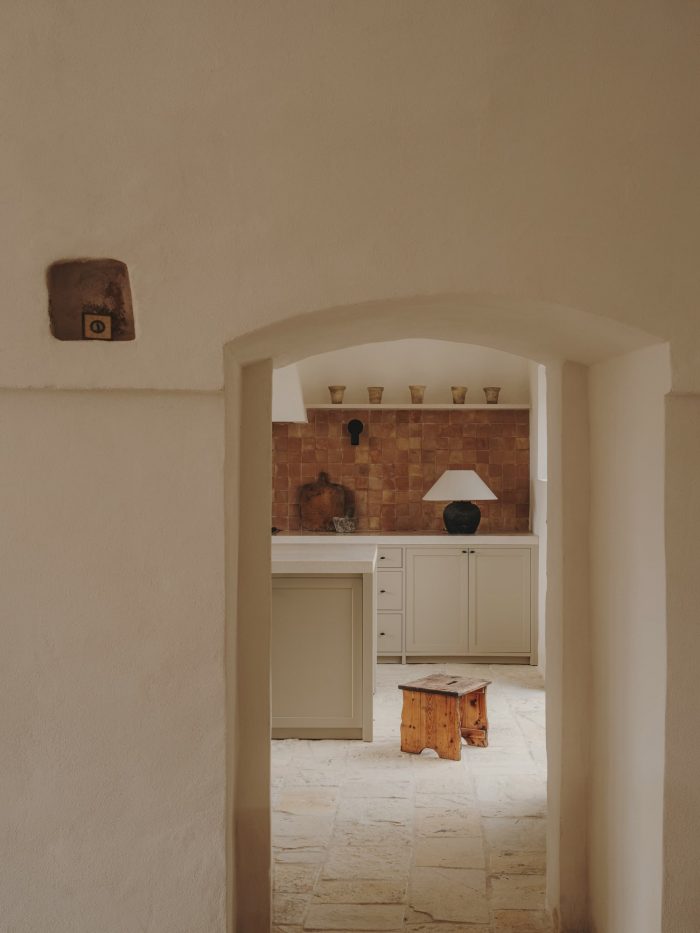 Regarding the renovation process, we tried as hard as possible to leave the exterior patina where we could. Together with Ian and Maree, we spent days scraping off years of flaky paint, to reveal the beautiful stone of the portico. The inside needed to be fully plastered, so we brought in an artisan who makes his own lime plaster and lime paints. All the old stones were repositioned, and we also added a new chianca to the floors that matched the old ones perfectly.