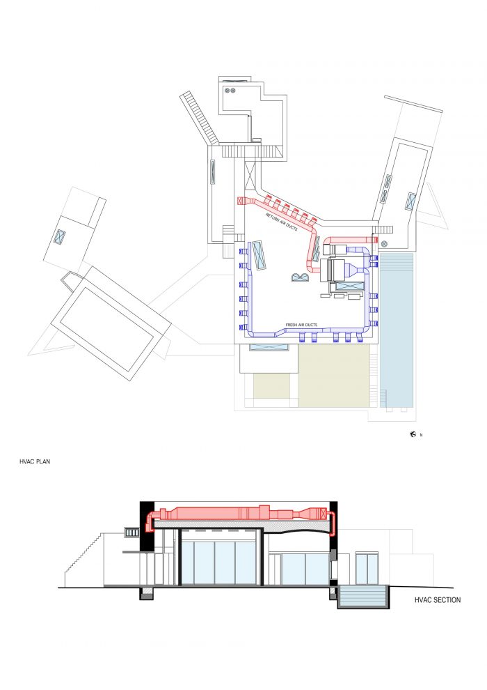 5. An active cooling method drawing its inspiration from ancient ways of catching cool breeze into spaces, this method of air conditioning uses the thickness of the walls to its advantage, carving out small ducts within them which carry this cool air and circulate it through the large volume of the house in turn also cooling the walls in concrete.