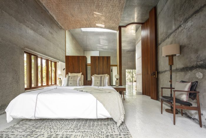 3. The house is planned as a large studio space with just one bedroom for the couple. Two guest rooms are stacked in a separate building as an annex to the main house.