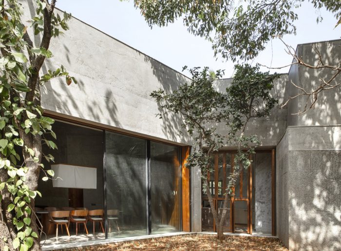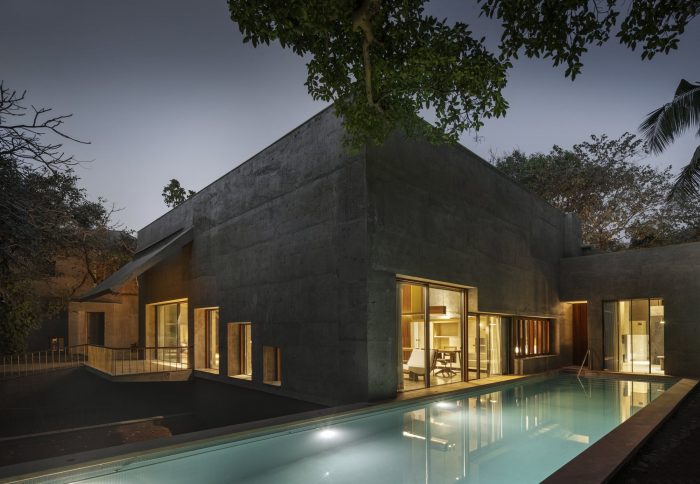 The House of Concrete Experiments is a residential project, located in the coastal town of Alibaug, near Mumbai. Set on the foothills of Deotalai in Zirad, the house is amidst a mango orchard.