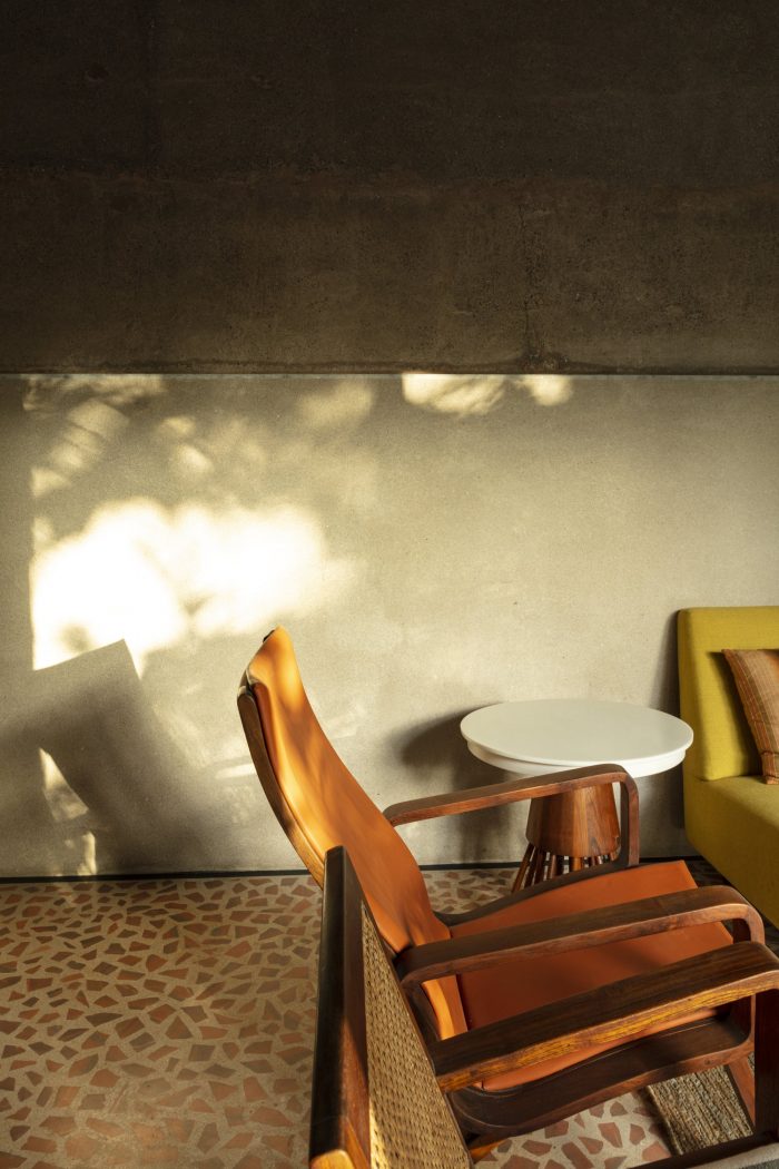 4. The floors are made by recycling waste stone pieces cast in concrete terrazzo. Black kadappa, white marble, and pink marble are all used in different areas in different forms to make the flooring a large artwork. Bedroom and bathroom floors are done in small broken tile chips laid in cement that gleam and reflect the sunlight brightening up these spaces.