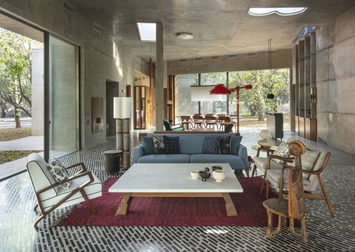 Walls and structures are placed so as to become sculptural elements and not on a particular grid. The house is a large column-free space, with a seamless flat concrete ceiling with no internal walls that hinder this concrete volume.