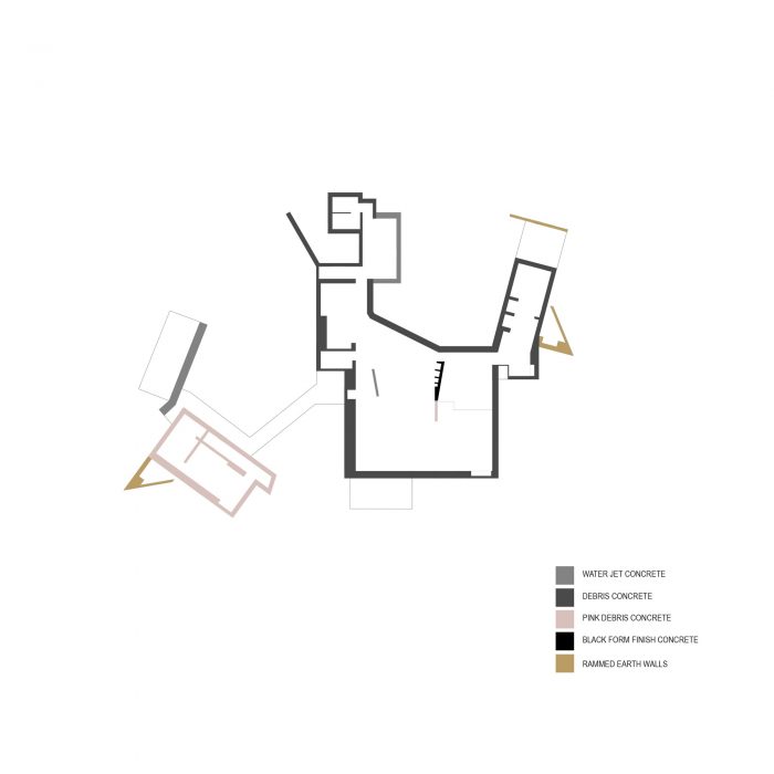 The house is true to one material; that is cast concrete. The tactile walls are all cast with different experiments in concrete that render specific textures to each of the walls. The experiments include debris cast concrete; waterjet concrete and form finish concrete with pigments.