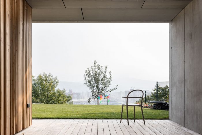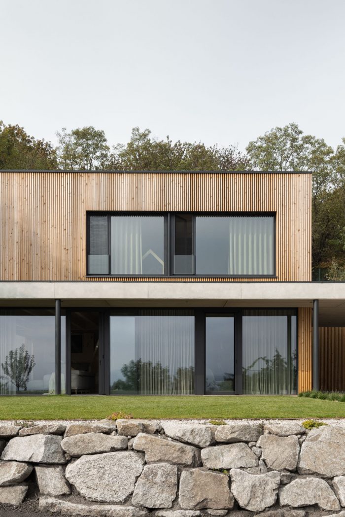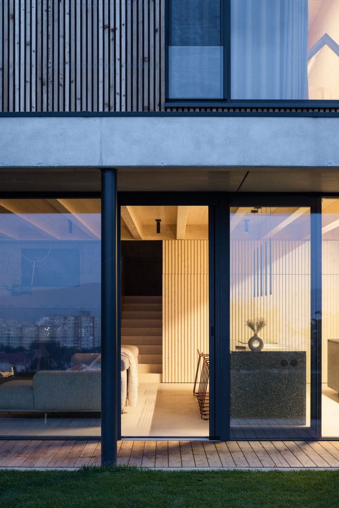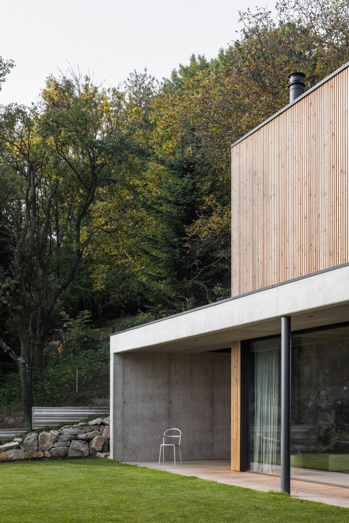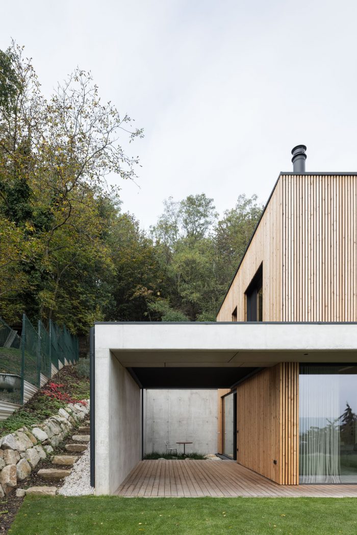 The construction of the house is designed as a reinforced concrete foundation tub placed transversely in the terrain, with prefabricated objects made of CLT panels installed inside. The asymmetric placement of the house within the tub separates the areas of the terrace and the carport. These external spaces are connected longitudinally by a walkway with a canopy that forms a kind of frame around the object.