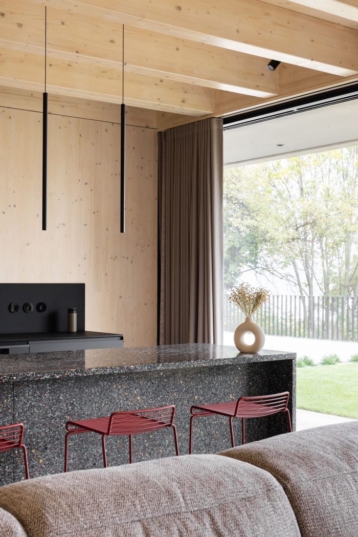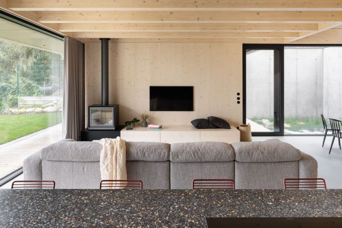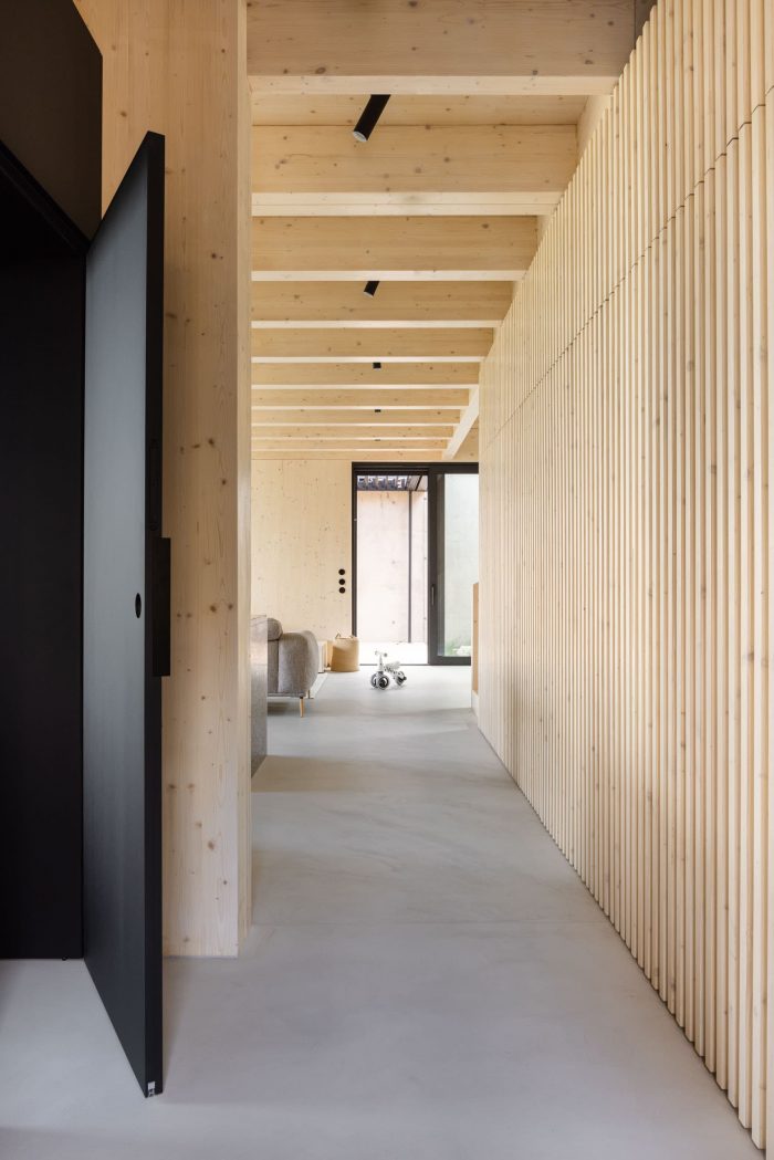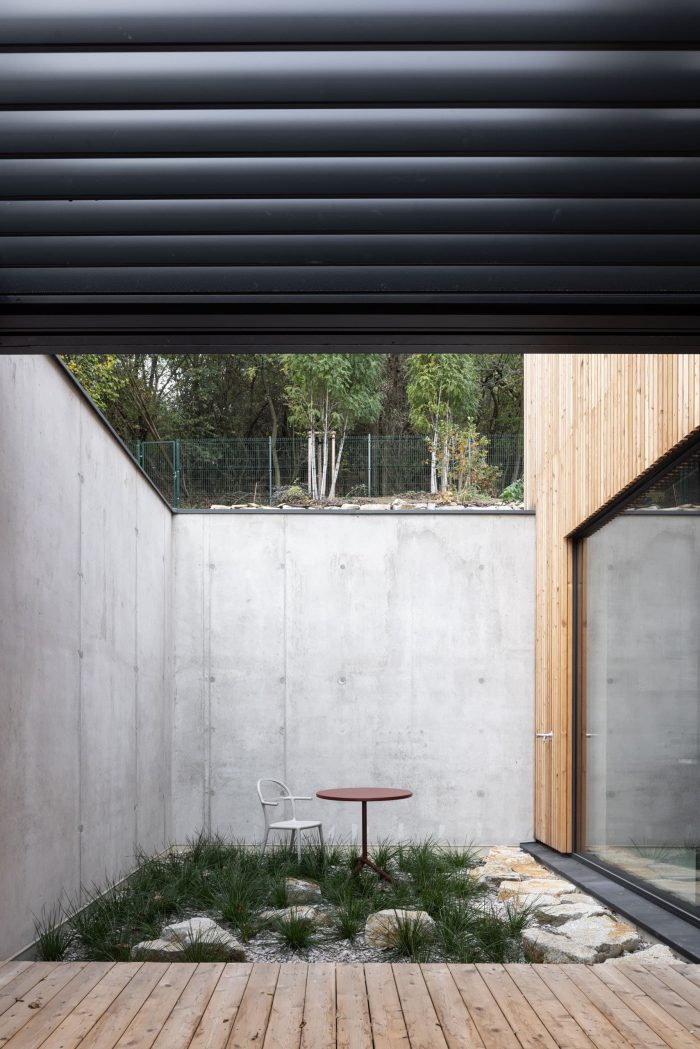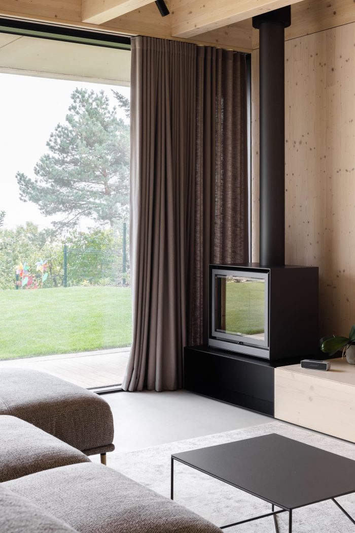 The construction of the house is designed as a reinforced concrete foundation tub placed transversely in the terrain, with prefabricated objects made of CLT panels installed inside. The asymmetric placement of the house within the tub separates the areas of the terrace and the carport. These external spaces are connected longitudinally by a walkway with a canopy that forms a kind of frame around the object.
