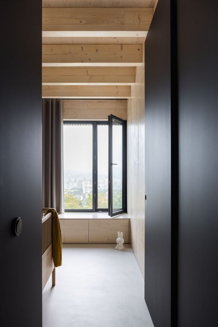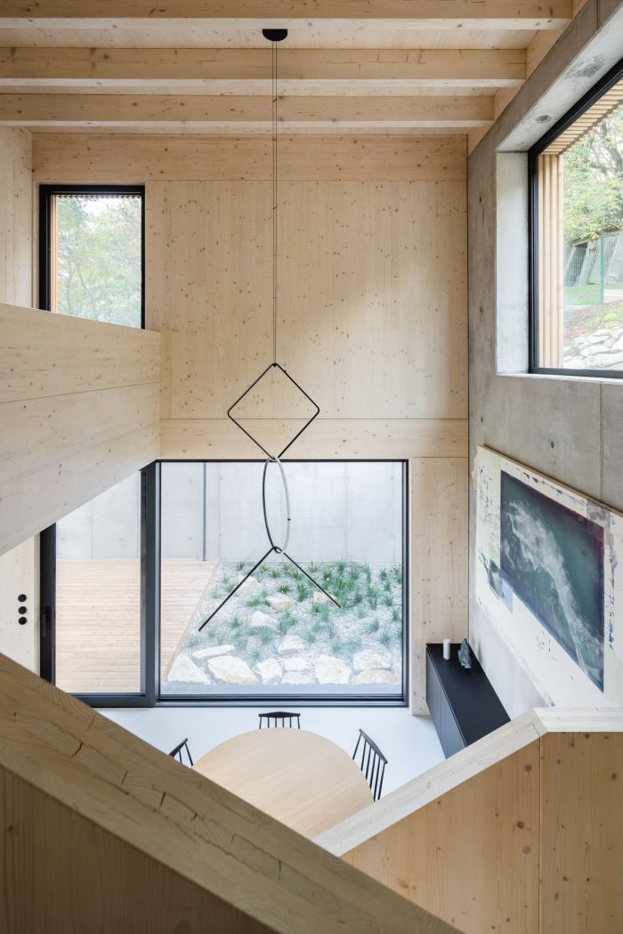 通过画廊和中庭,南面和西面的光线进入了原本朝东的白天部分,在白天创造了不同的气氛。在上层,有面向东方和南方的儿童房,有公共卫生和带有独立衣柜、厕所和浴室的卧室区,通过一个全景窗可以看到森林。