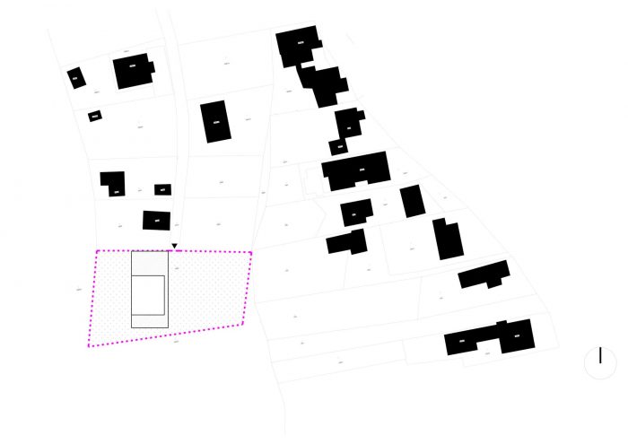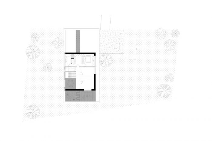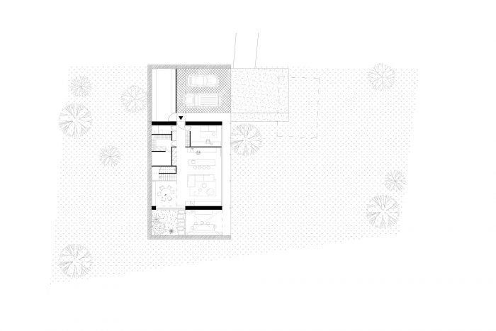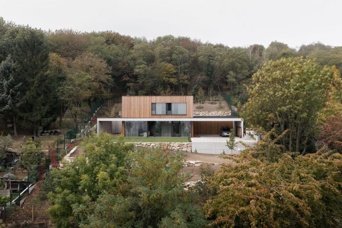 The house is situated in the outskirts of Dúbravka in Bratislava, on the border with a forest. By placing it in the central part of the plot, it is directly connected to the entrance from the public road, The placement of the house in the descending terrain opens it directly to the views of the ridge of Little Carpathians and Dubravka below.