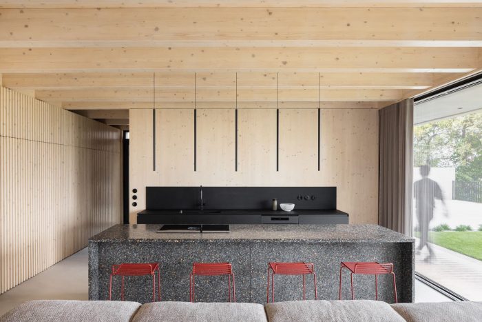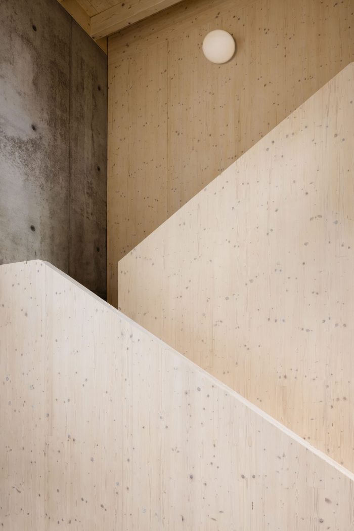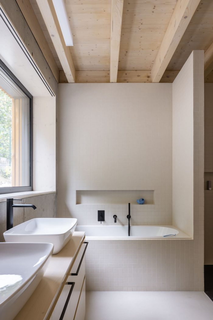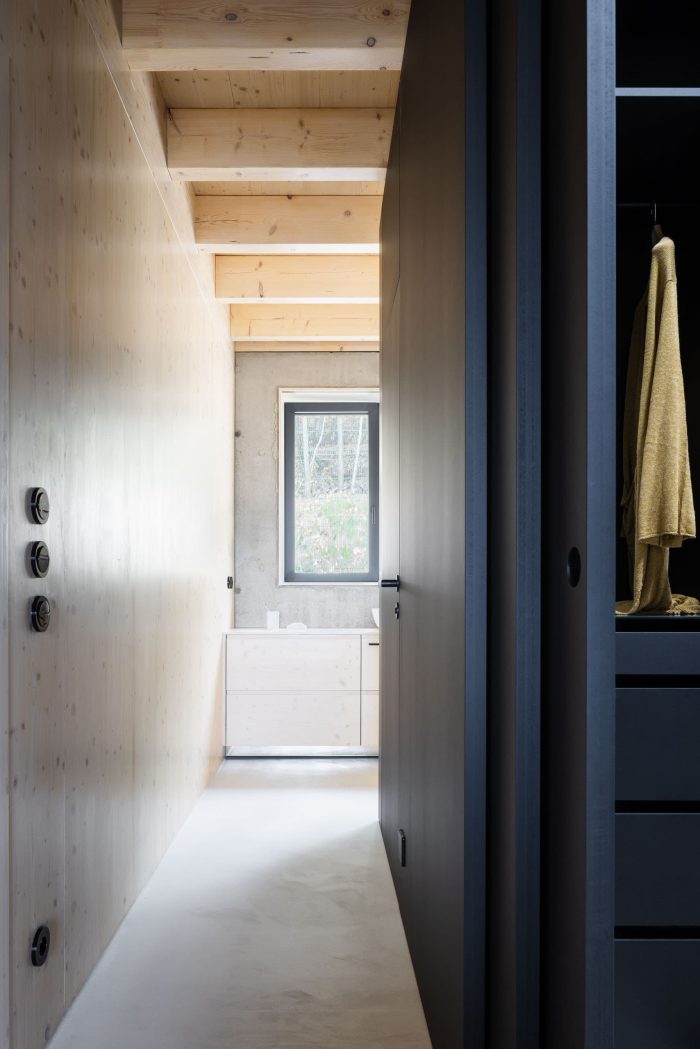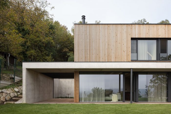 The focus was to design a house that seamlessly fits into its environment with its scale and visual approach. It is strongly characterized by acknowledging its materiality. The concrete and wooden surfaces smoothly transition from the interior to the exterior and create visual continuity forming a clear composition of cubic masses