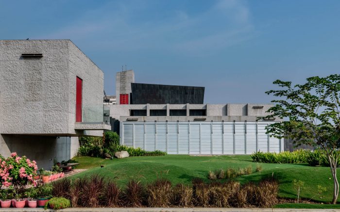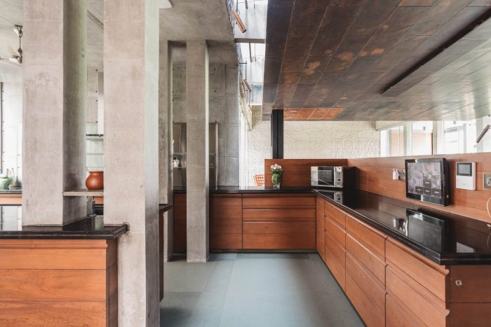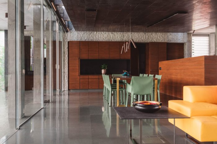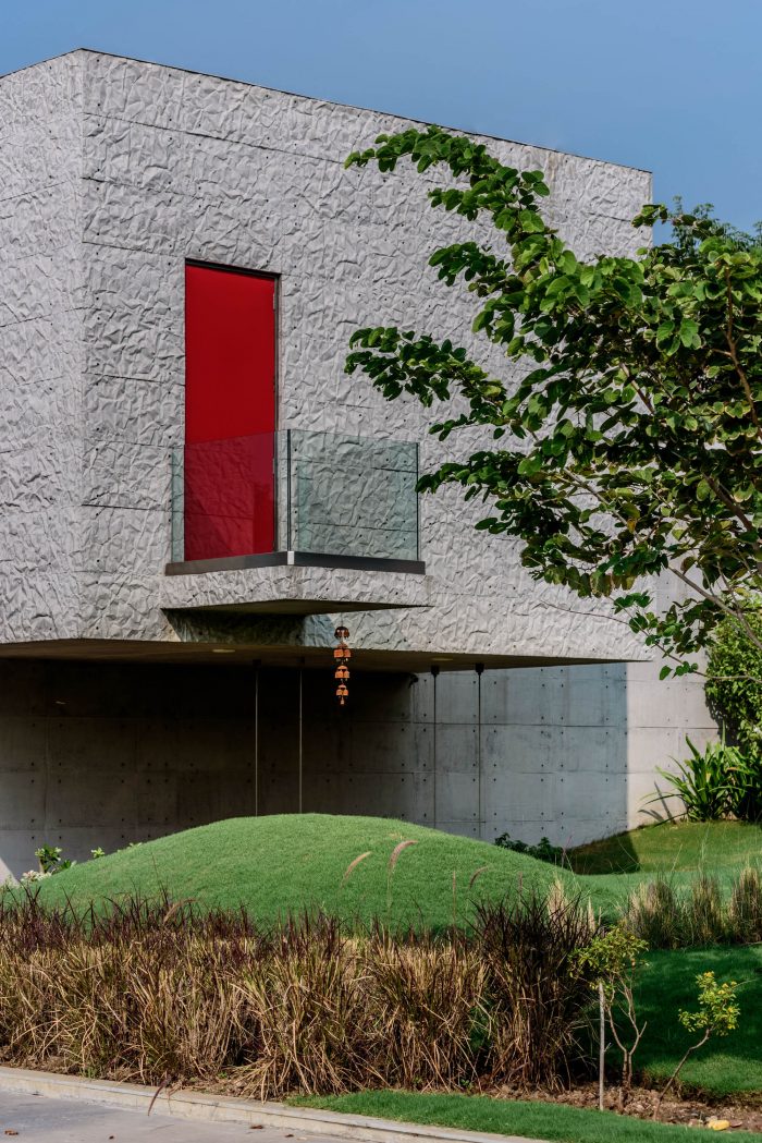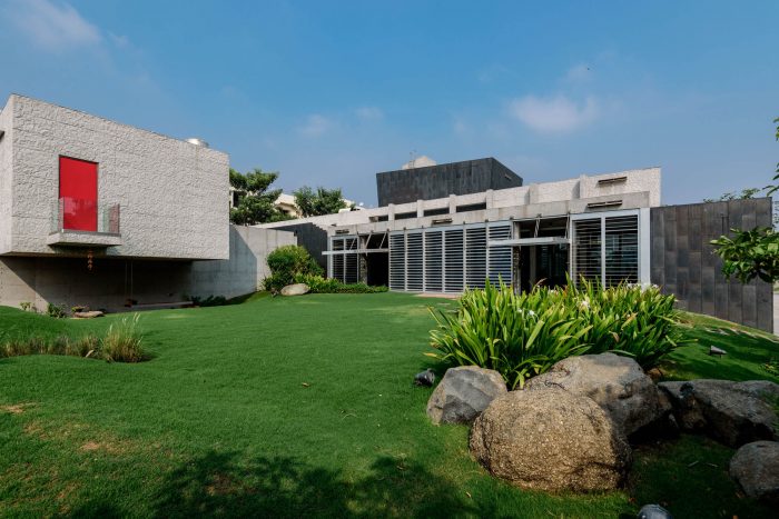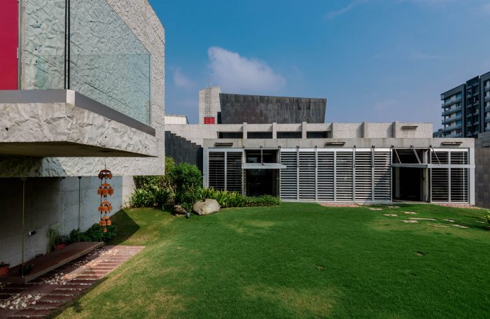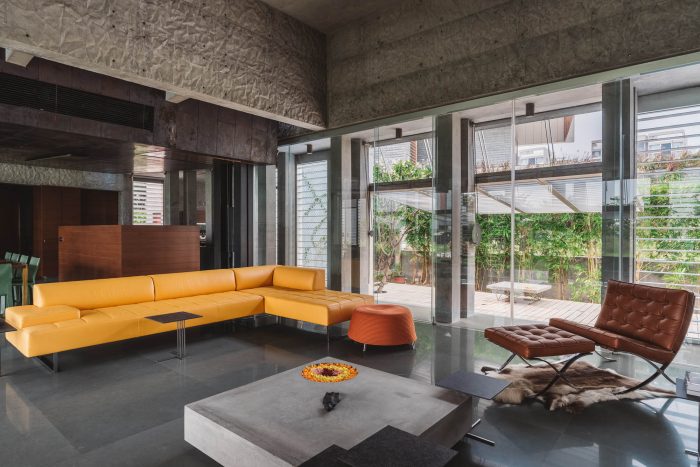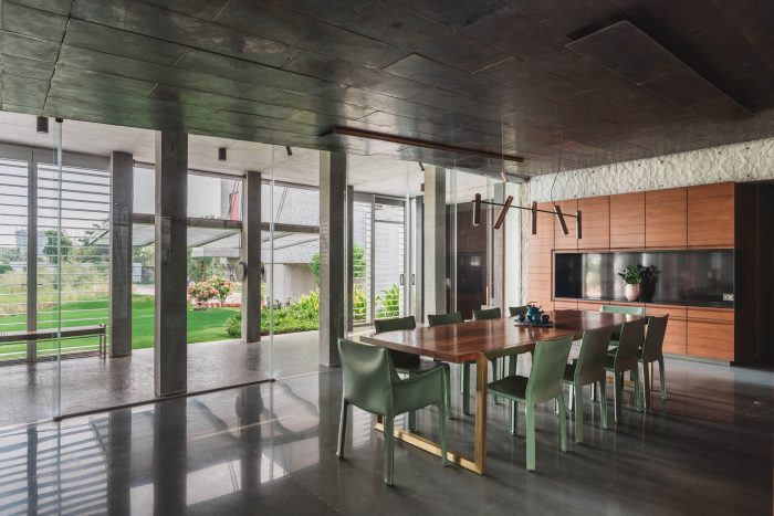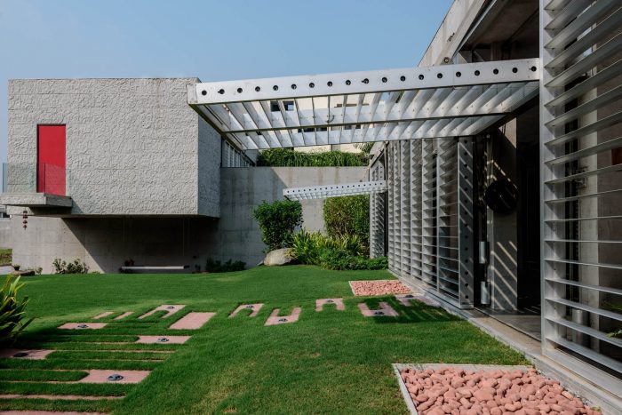 In terms of materiality, the house is wedded to a palette which is natural and far away from anything synthetic. The paint free shell of the house is constructed in form finished concrete. The interesting texture has been achieved through creating fiber moulds out of crumpled aluminum foils, and creates equally beautiful drama in the day and night, responding to the light falling on to it from different directions. The floor is a combination of large sized polished and leather finished Kotah Stone. Rest is all natural anodised aluminum, glass, black granite and teak wood. Copper sheets have been used to define the axial movement tunnel and the floating family room. Bright colored compact laminate sheet have been used in some doors to add sharp accents in an otherwise a monotone grey-silver house.