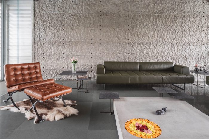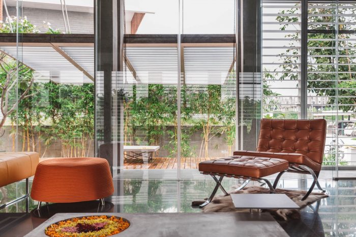 在材料方面,房子采用了自然的调色板,远离任何合成材料。房子的外壳没有油漆,是用成品混凝土建造的。有趣的纹理是通过用皱巴巴的铝箔制作纤维模具来实现的,在白天和晚上都能创造出同样美丽的戏剧性,对从不同方向落在上面的光线做出反应。 地板是由大尺寸的抛光和皮革处理的Kotah石组合而成。其余都是天然的阳极氧化铝、玻璃、黑色花岗岩和柚木。铜板被用来定义轴向运动通道和浮动的家庭房间。在一些门上使用了鲜艳的紧凑型层压板,为原本单调的灰银色房子增添了鲜明的亮点。