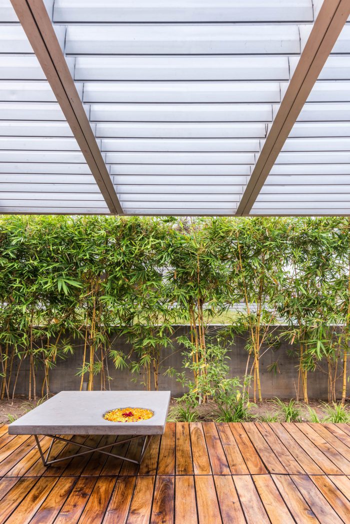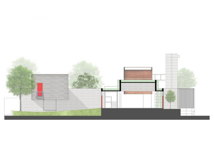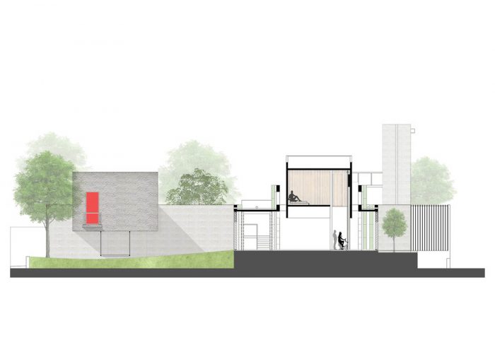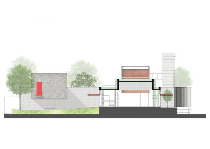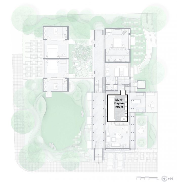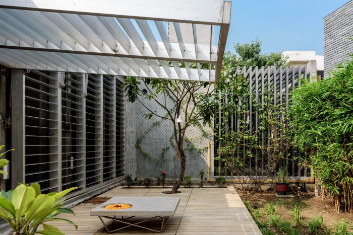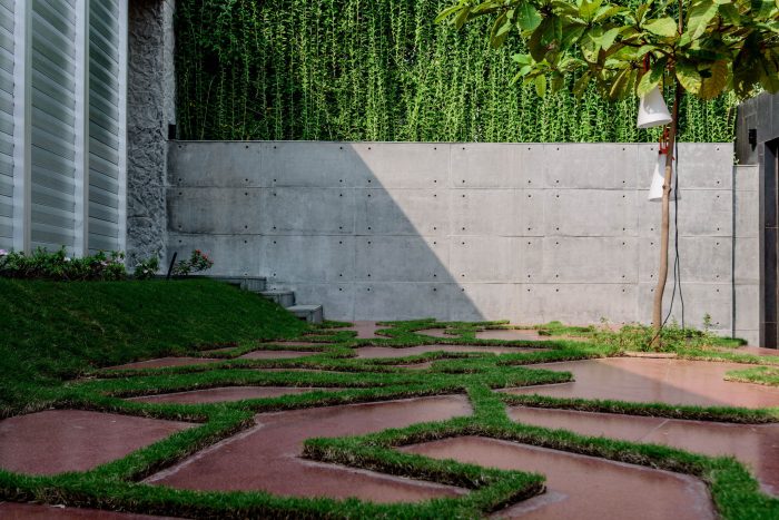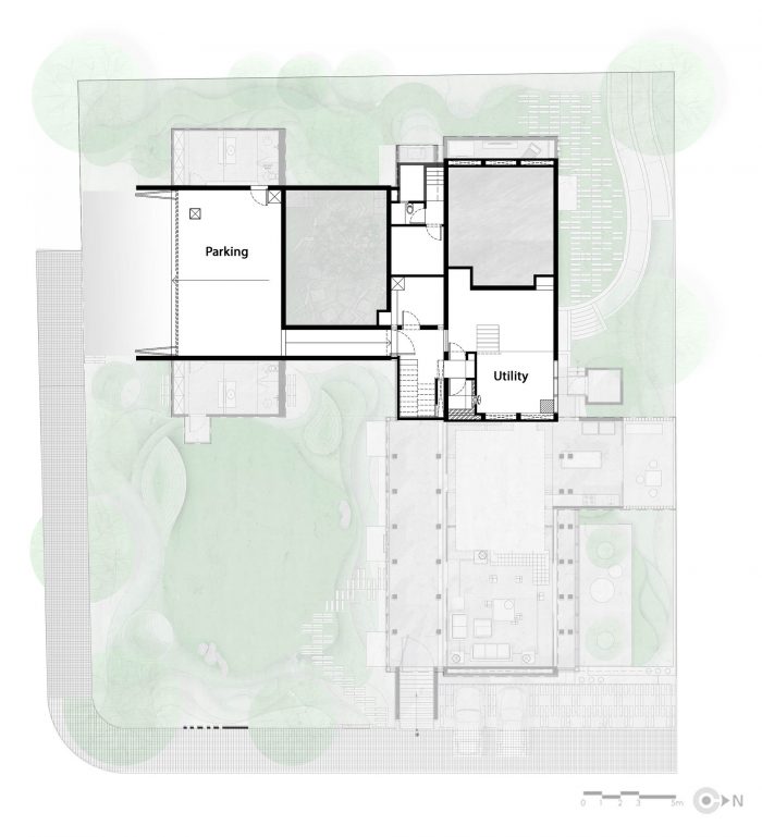 The two courtyards - public and private have diverse landscape approaches as a response to the usage. The public courtyard is primarily a lawn area with some mounds to create some soft contrast to the very straight line building form. The private courtyard has a tree with the flooring pattern reflecting the shadow of the branches of the tree once the tree grows to a larger size. The backyard is primarily a kitchen garden. The simple practical system of collecting and composting organic waste to create own manure has been significantly helping the growth of the greens in the project.