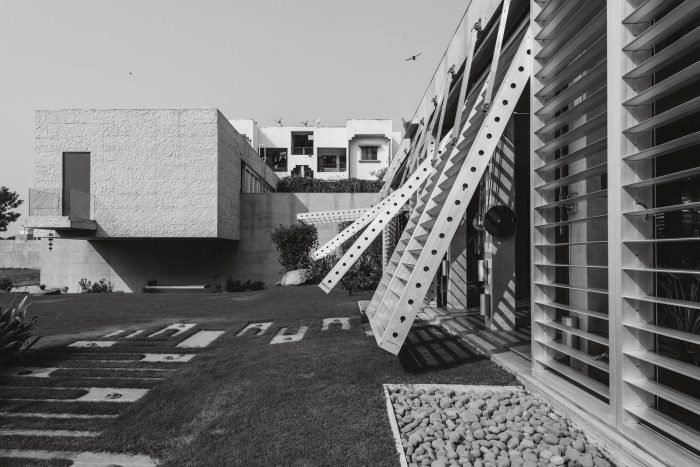 The site at Surat is just about 10 km from the Arabian Sea, and experiences a Hot and Humid climate. As a response to that, the North and South of each space including the four bedrooms has indigenously designed operable louvers system with an openable layer of glass, from wall to wall. This allows a wonderful connection with the landscape, and an incessant draft of breeze flowing across the rooms. One practically feels living on the ‘Otta’ all the time. These louvers control amount of light, wind, rain, and dust entering the space; and also keeping the burglars out all the time. The idea has been taken one step further in the living block, where the entire louvre frames get manually lifted to become pergola, reminiscent of a bird opening up its wings. Very interesting user-friendly mechanisms for lifting and locking the louvers have been engineered using number of gears and levers.