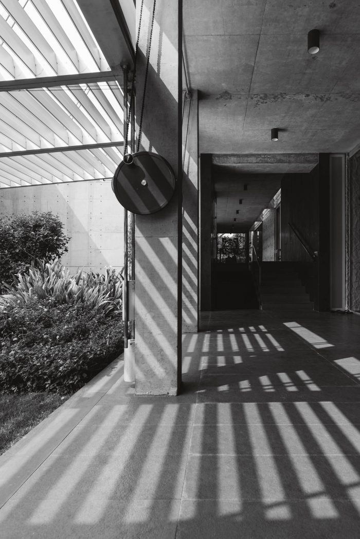 苏拉特的场地距离阿拉伯海仅10公里,气候炎热潮湿。作为对这一点的回应,包括四间卧室在内的每个空间的北部和南部都有本土设计的可操作的百叶系统,从墙到墙都有一层可打开的玻璃。这使得与景观的联系更加紧密,并且有源源不断的微风在房间里流动。人们实际上感觉一直生活在 "奥塔 "上。这些百叶窗控制着进入空间的光线、风、雨和灰尘的数量;同时也将窃贼一直挡在外面。这个想法在生活区又进一步,整个百叶窗框架被手动抬起,成为凉棚,让人联想到鸟儿张开翅膀。使用一些齿轮和杠杆,设计了非常有趣的用户友好机制来提升和锁定百叶窗。