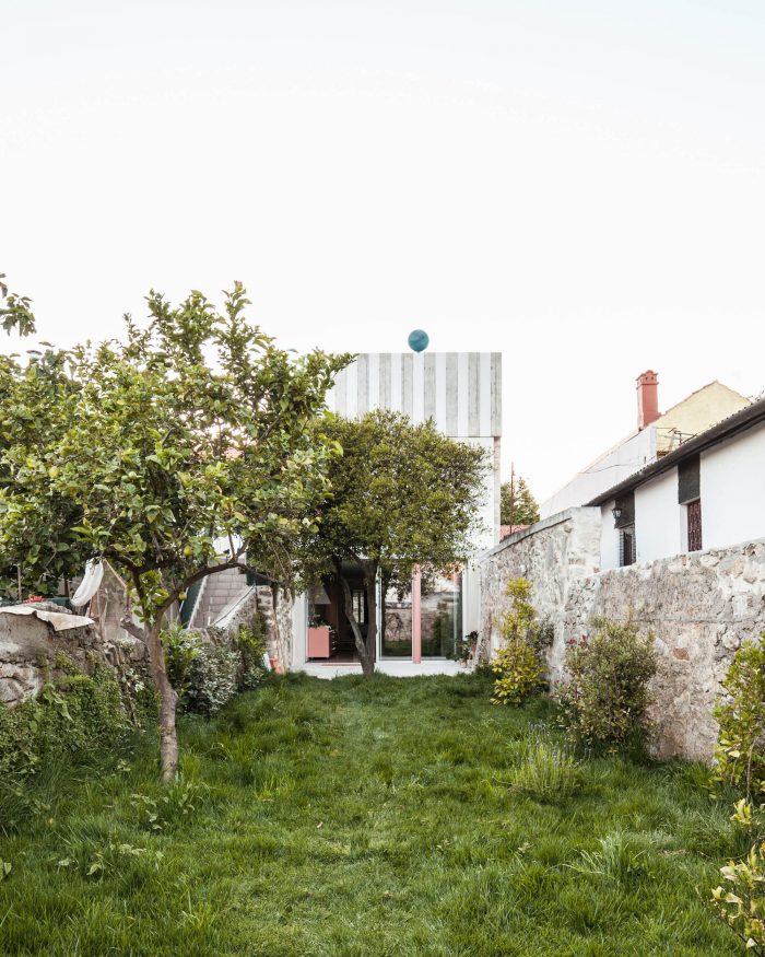 The back façade didactically reflects the three orders. The ground floor is completely open to the garden while on the first floor a single window frames a certain perspective of the dense context. The striped concrete cornice is introduced on both elevations and a blue circle, aligned with an unnecessary pink column, ends the peculiar composition. A ground floor dissolving into the garden, a precisely divided piano nobile, a headstrong roof.