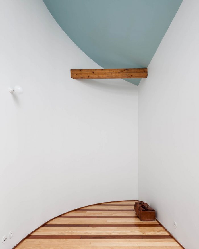 In contrast with the opposing spatial orders, materiality holds the house together. Fluent white walls are stuck between striped wooden floors and light blue ceilings, disturbed once in a while by flat blue doors, touches of marble or a pink kitchen.