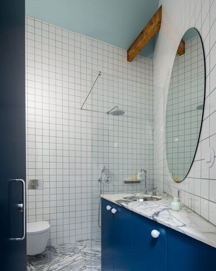 与对立的空间秩序相比,物质性将房子凝聚在一起。流畅的白墙被卡在条纹木地板和浅蓝色的天花板之间,偶尔被平坦的蓝色门、大理石或粉红色的厨房打乱。