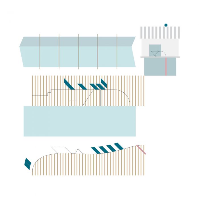 Conversely, the first floor is a composition of intricate rooms and rhythmic collisions of different geometries, a sequence of irregular spaces. The complexity is introduced to accommodate all the necessary programs, adapting to the narrow perimeter of the site. A set of equally distanced wooden beams supporting the roof causes inconvenient intersections.