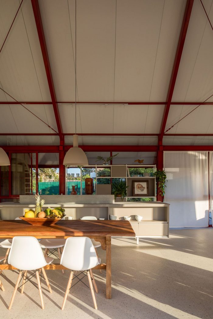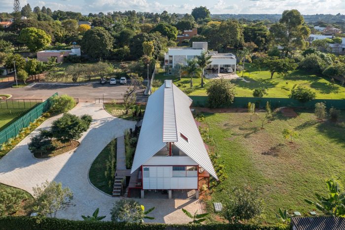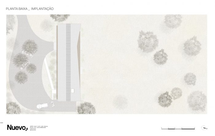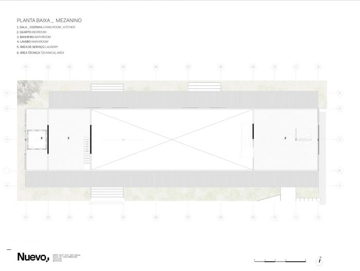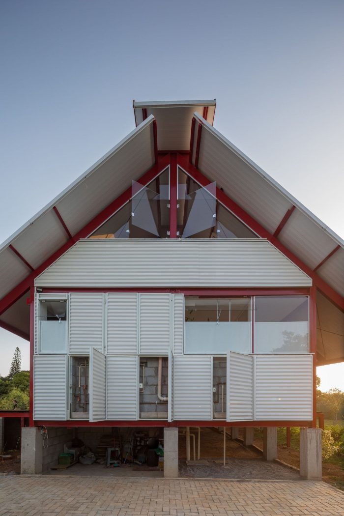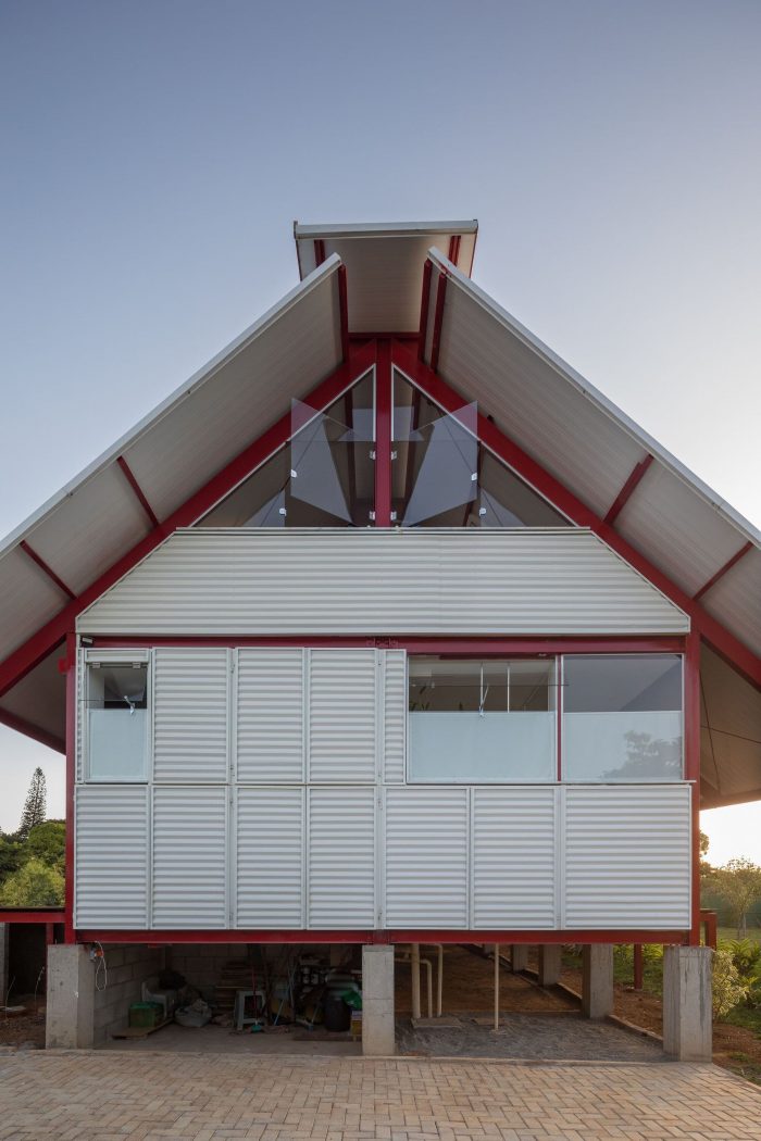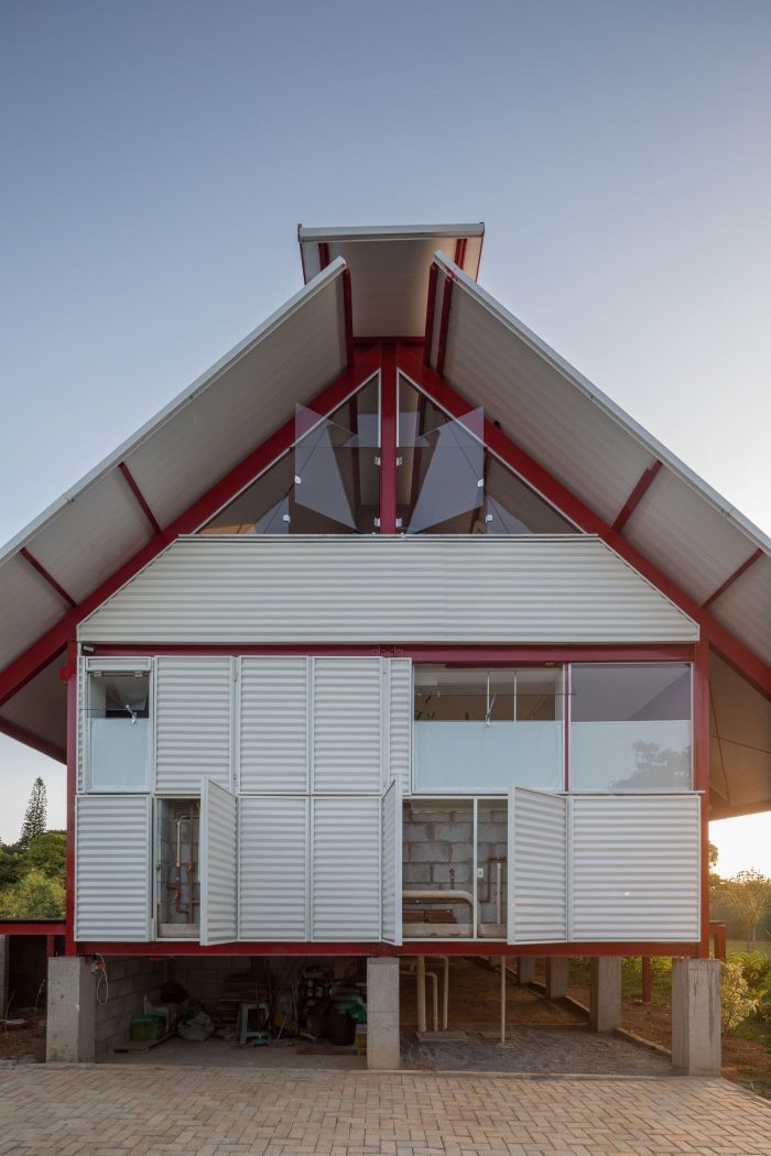 The house is suspended from the ground as a longitudinal platform, with a programmatic arrangement organized in two intimate and service modules positioned at the extremities, united by a central space with doubled height. The main purpose of suspending the house is to avoid infiltration problems and to optimize indoors thermal efficiency. This solution also allows for the electrical, plumbing, and sewage installations to be kept apparent. A pit excavated under and along the platform provides the necessary conditions for practical and comfortable maintenance of the installations. The toilets are positioned on the side gables, allowing for agile and sustainable maintenance from the external area of the house through wall shafts.