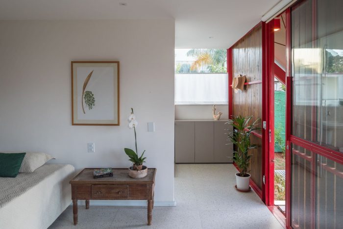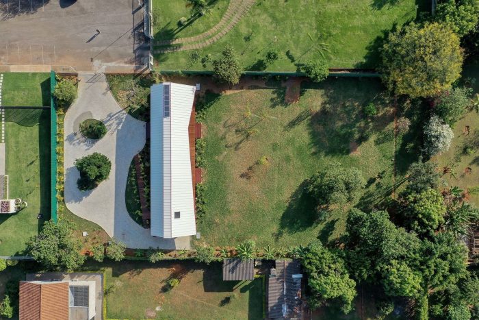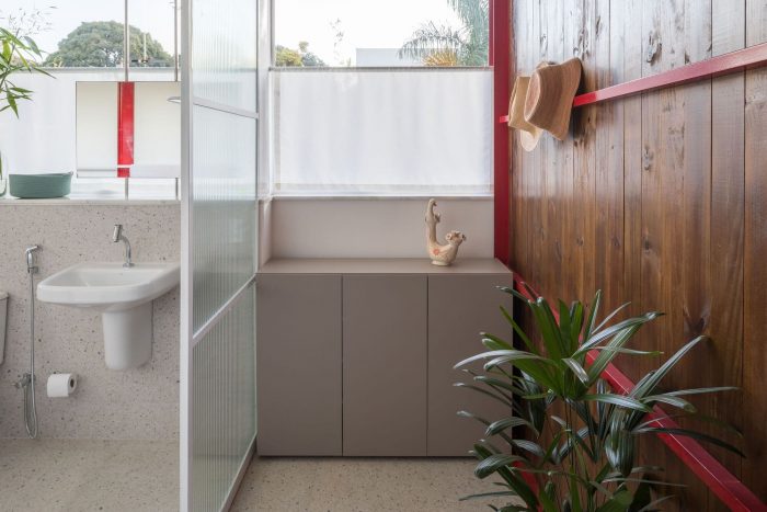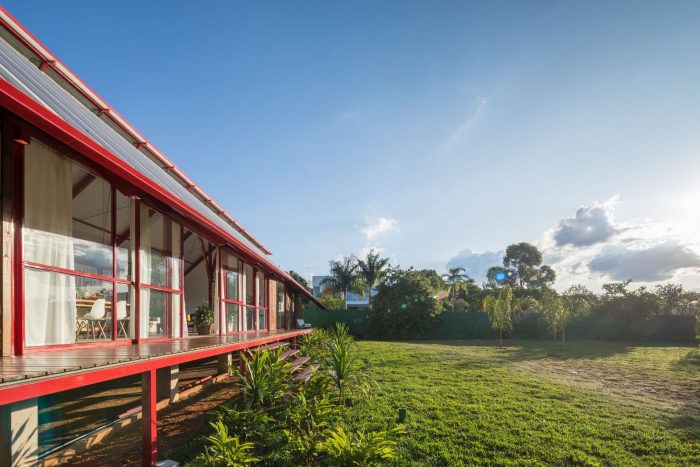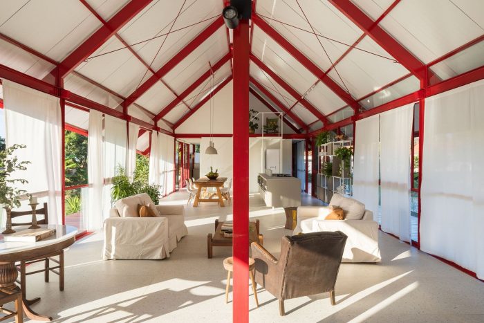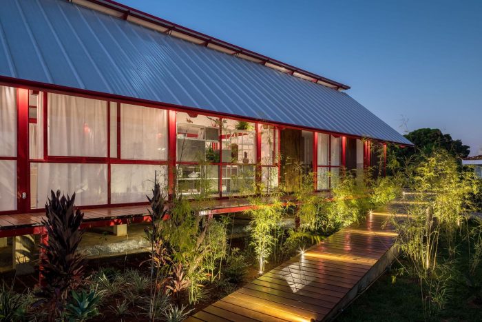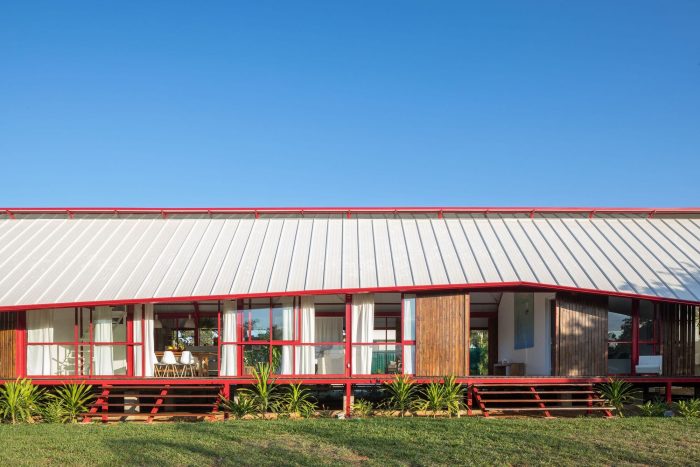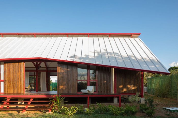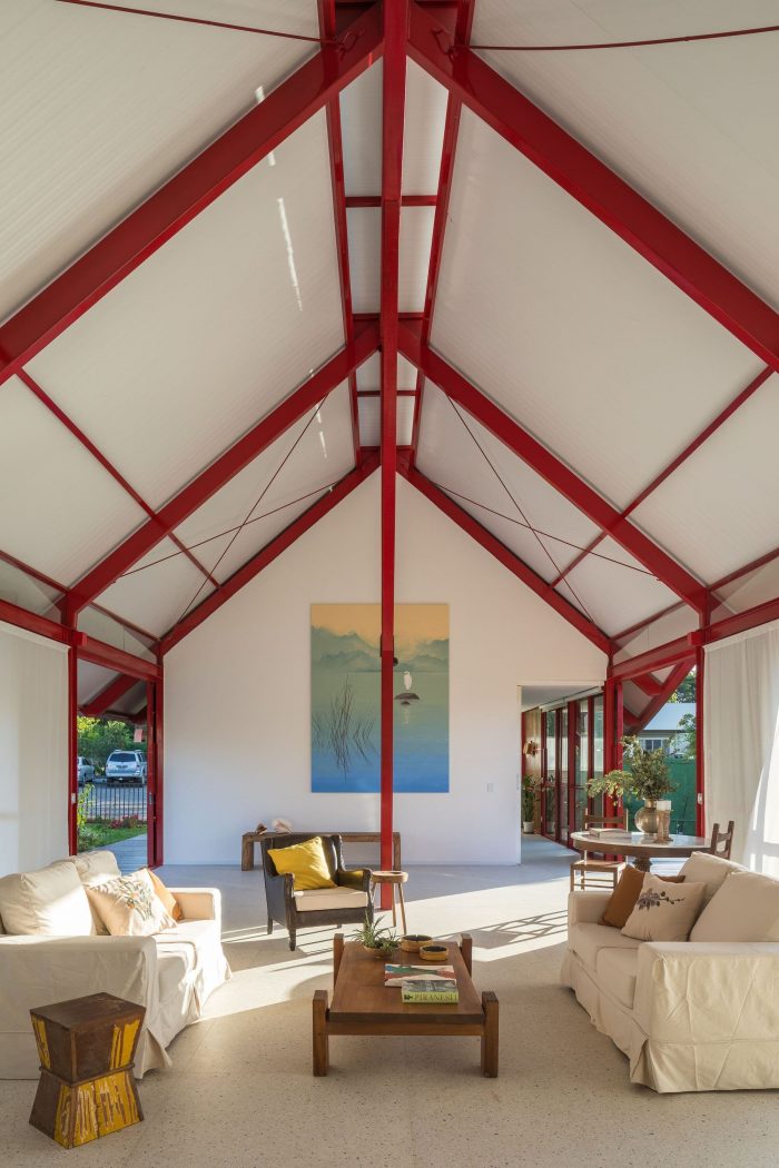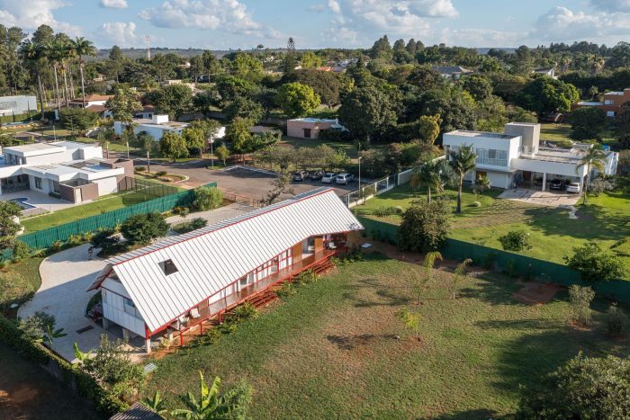 The house is suspended from the ground as a longitudinal platform, with a programmatic arrangement organized in two intimate and service modules positioned at the extremities, united by a central space with doubled height. The main purpose of suspending the house is to avoid infiltration problems and to optimize indoors thermal efficiency. This solution also allows for the electrical, plumbing, and sewage installations to be kept apparent. A pit excavated under and along the platform provides the necessary conditions for practical and comfortable maintenance of the installations. The toilets are positioned on the side gables, allowing for agile and sustainable maintenance from the external area of the house through wall shafts.