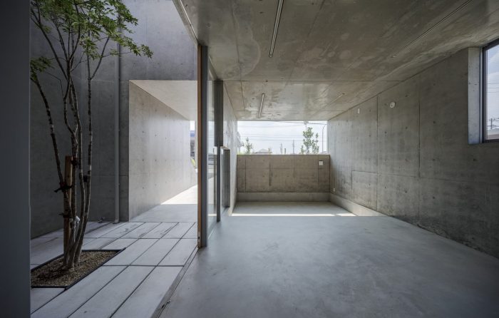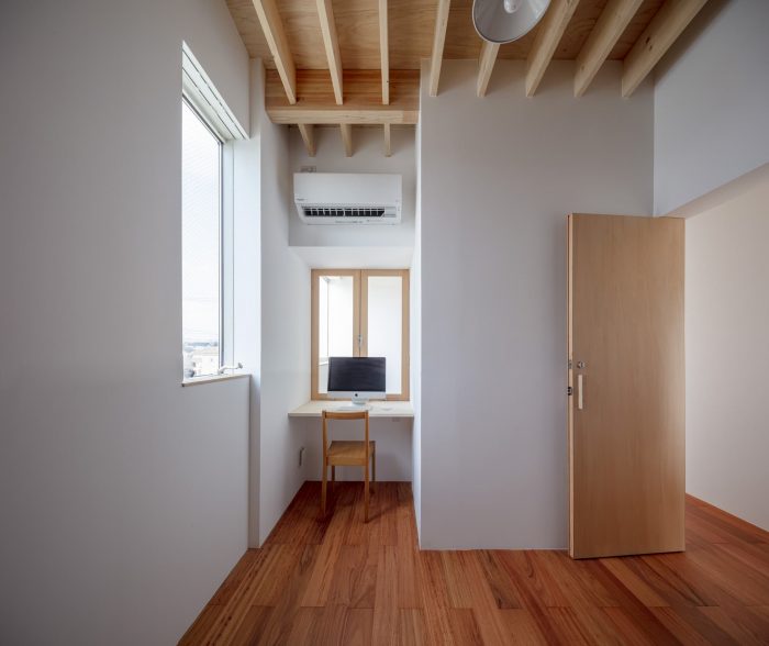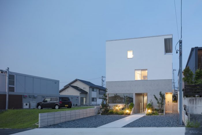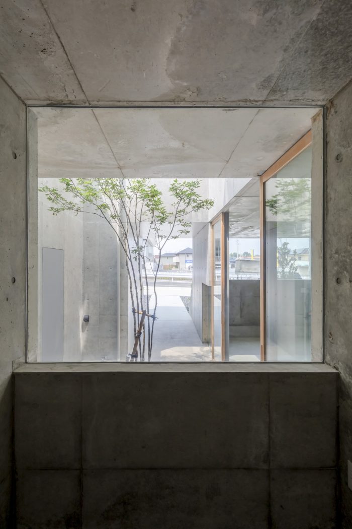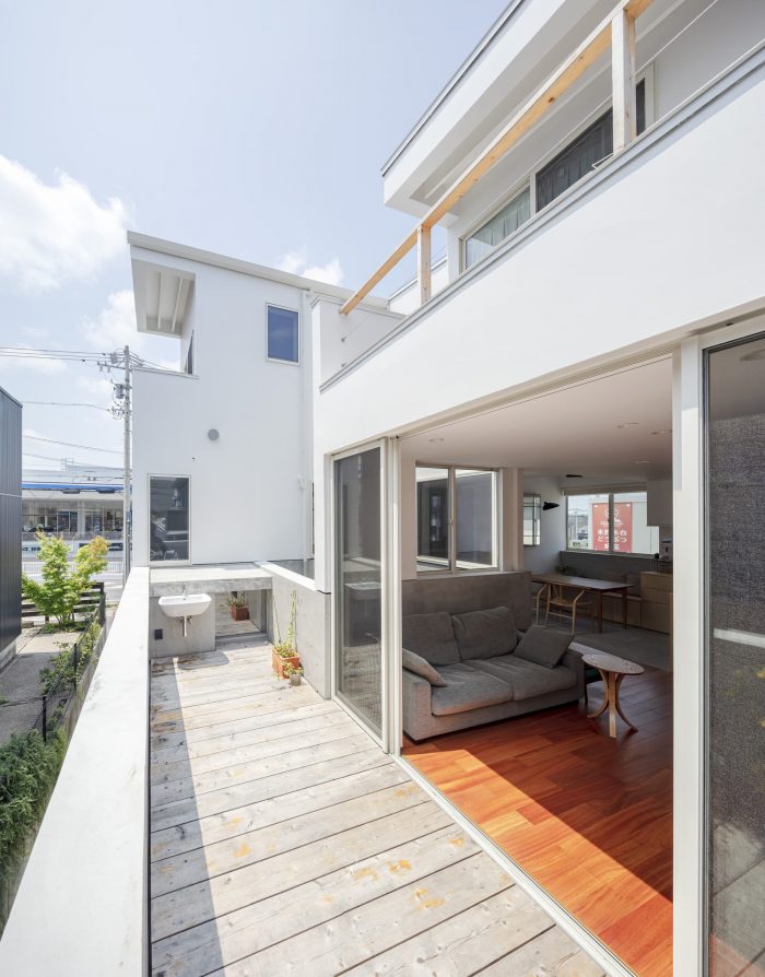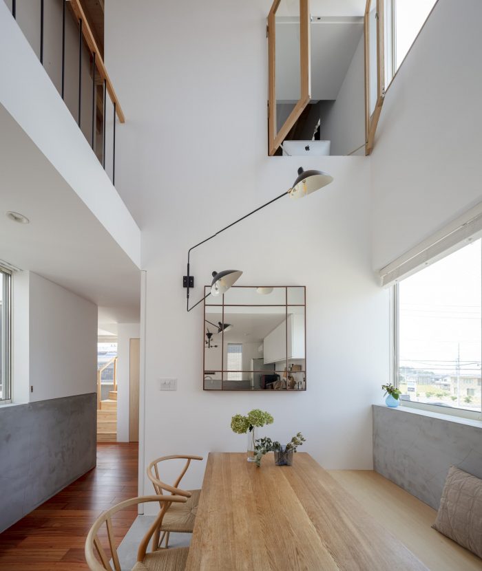 Visible or not visible - This is a house for a couple and their children on a corner of a residential zone in Miyoshi City, Aichi. The front road of the house is used by the people of the community as a space where neighbors enjoy their daily chat and children’s playground. The adjacent plot is a parking space for the neighboring apartment building. Considering the environment surrounding the house where one could constantly feel the presence of someone or being watched, we usually close ourselves inside the house. Instead, we tried to create a house with a hook-shaped open space that crosses laterally and vertically to form visible and invisible surfaces, where we could keep an adequate distance and connection with the surroundings.
