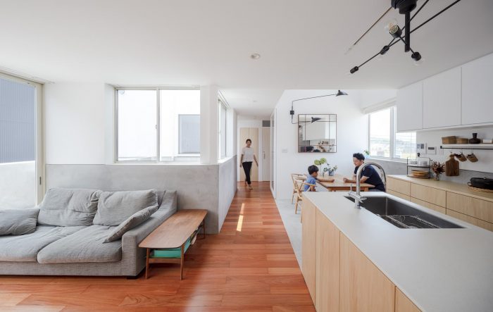We came to think that the comfortable distance between the kitchen and living spaces, passings on the bridge, relaxing on the grand stairs, and natural light and wind coming from the two terraces created by the lateral and vertical layering and crossings of the hook-shaped circulation can change the open space to an active “stepped alley” from what used to be just a leftover space between the two masses. The central “stepped alley” that acquired vague visibility and connection to its depth became an invisible “back street” from the city while becoming a “main street” between the two building masses inside the house. We expected that it would become an intermediate area that shows a bilateral character according to one’s standing point.